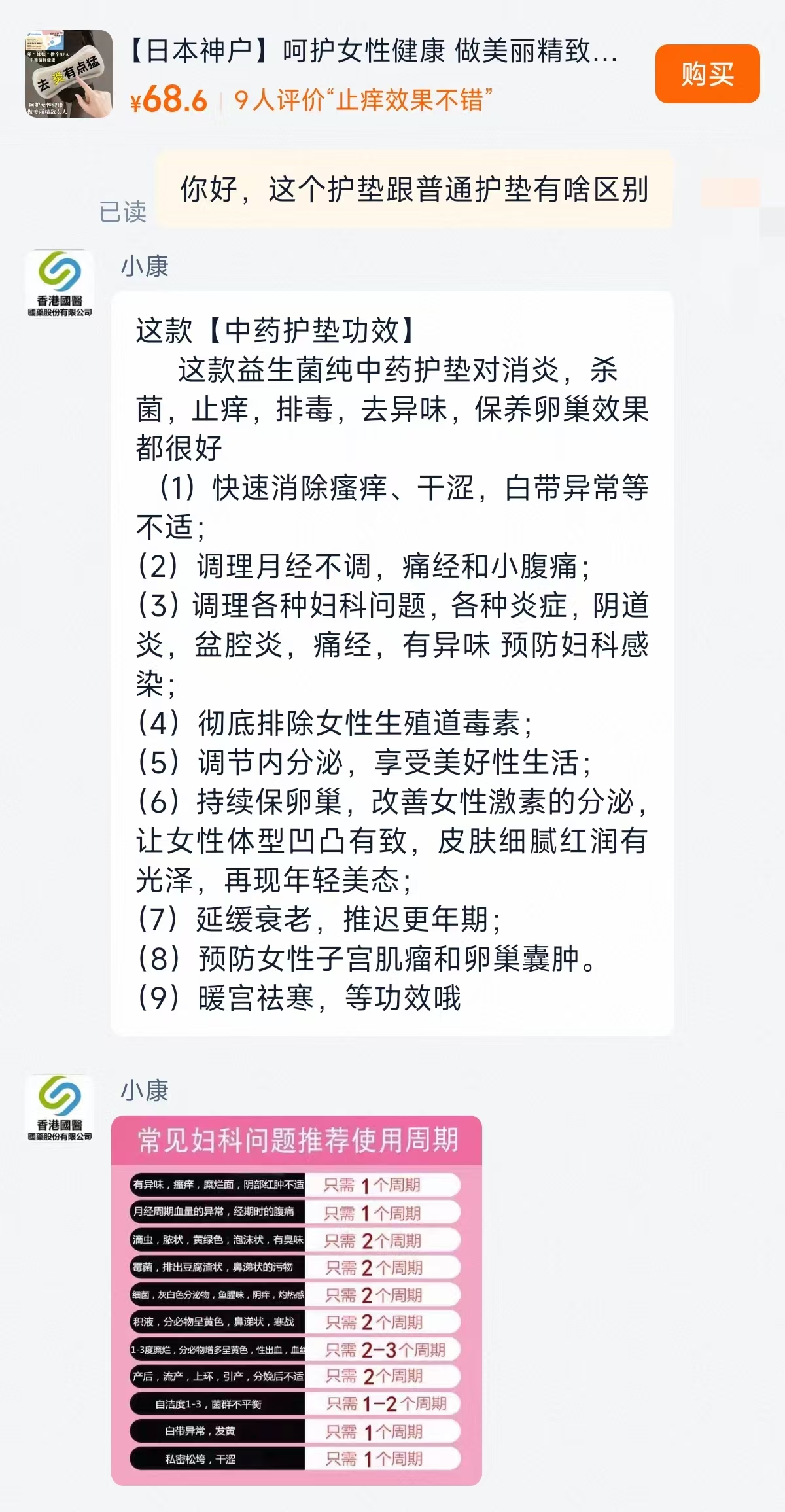 “香港国医调理馆”客服称其中药护垫具有多种功效。 电商截图