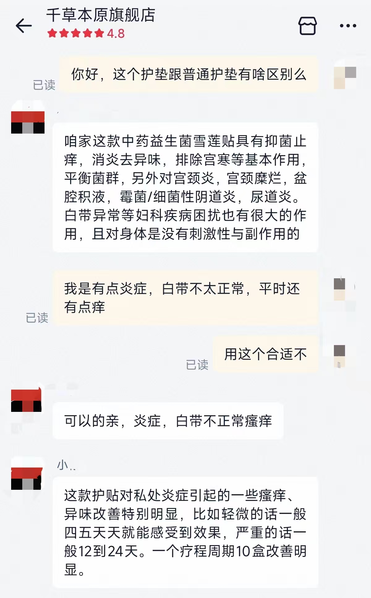 与上述情况类似,“千草本原旗舰店”所售的一款草本雪莲贴,产品页面上打出“净味内排,吸湿暖养,温和养护”等字样,宣称中医院研发,13味草本精华集中养护,“将难言之隐一贴而尽”。据客服介绍,“这款中药益生菌雪莲贴具有抑菌止痒、消炎去异味、排除宫寒等基本作用,平衡菌群,另外对宫颈炎、宫颈糜烂、盆腔积液、霉菌/细菌性阴道炎、尿道炎、白带异常等妇科疾病困扰也有很大的作用,且对身体没有刺激性与副作用”。