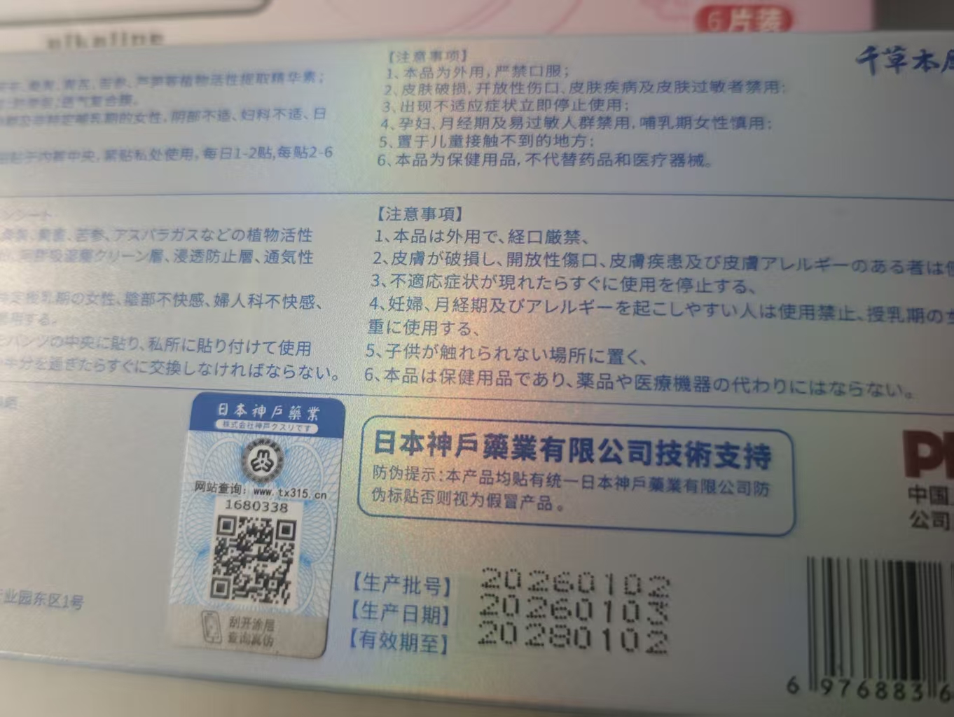 包装信息显示,这款标称“南阳市艾济堂生物有限公司”生产的益生菌雪莲贴,包装正面的产品名称、适用人群等文字大量使用日文,仅“日本神户药业有限公司”及“私护专研 平衡菌群”等功能宣称为中文字体。产品侧面用繁体中文写有“日本神户药业有限公司技术支持”。背面标签从“产品名称”“主要原料”到“适用人群”“使用方法”“注意事项”均使用中日双语标注,就连防伪编码也打上了“日本神户药业”。