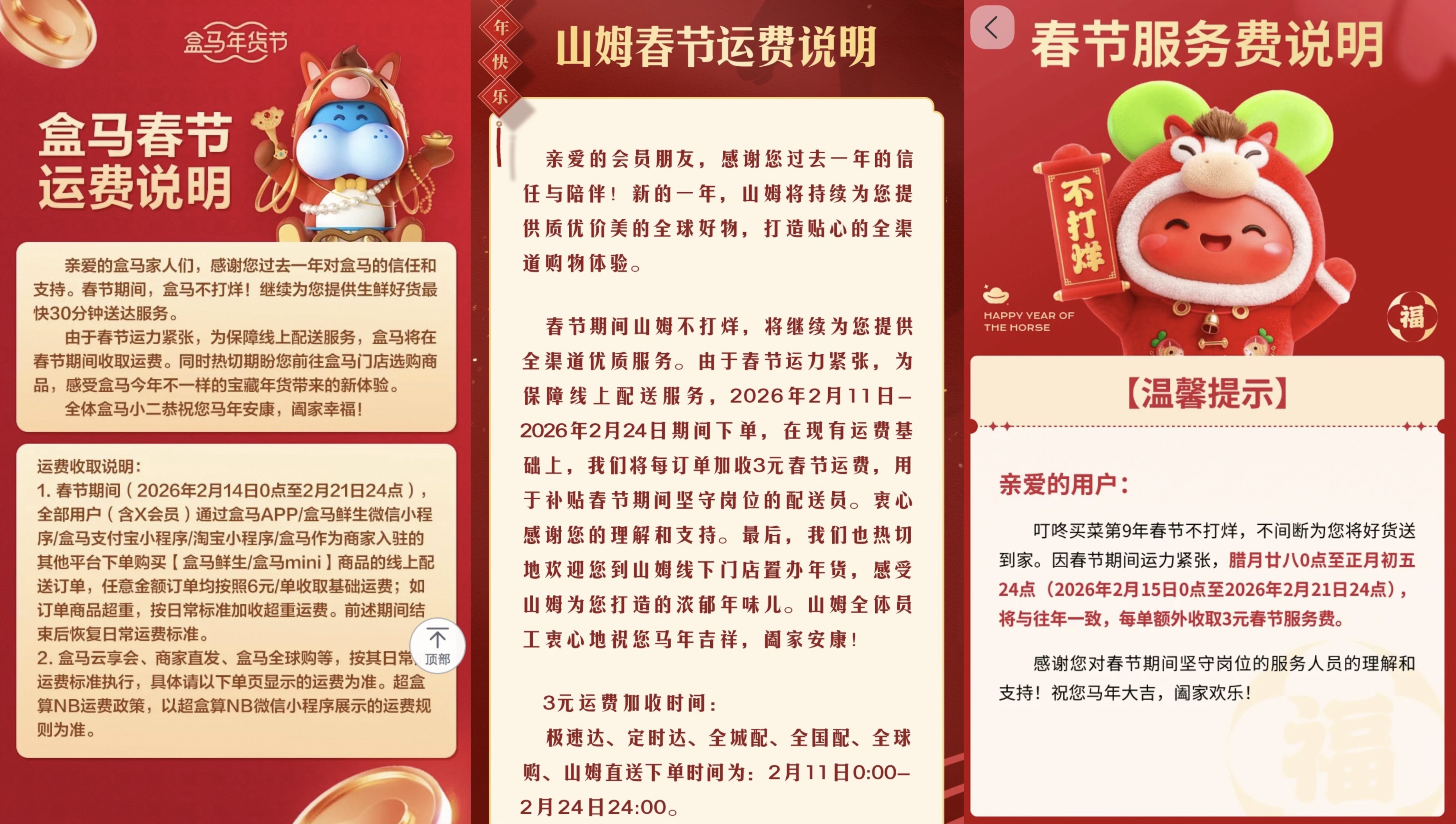 山姆发布春节运费说明称,由于春节运力紧张,为保障线上配送服务,2026年2月11日至2月24日期间下单,山姆线上配送在现有运费基础上将每单加收3元春节运费,用于补贴春节期间坚守岗位的配送员;盒马发布通知称,春节期间(2026年2月14日0点至2月21日24点)全部用户(含X会员)通过盒马App、盒马鲜生微信小程序等下单购买盒马鲜生、盒马mini商品的线上配送订单,任意金额订单均按照6元/单收取基础运费;如订单商品超重,按日常标准加收超重运费。前述期间结束后恢复日常运费标准;叮咚买菜通知显示,因春节期间运力紧张,2026年2月15日0点至2026年2月21日24点将每单额外收取3元春节服务费,与往年一致。