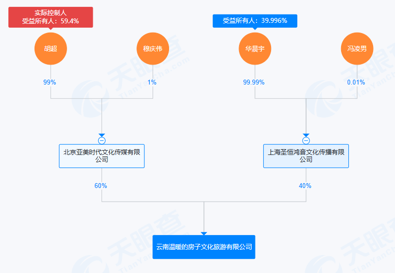 从股东信息上看,云南温暖的房子文化旅游有限公司由北京亚美时代文化传媒有限公司持股60%,而华晨宇实控的上海圣恒鸿音文化传播有限公司持股40%。北京亚美时代文化传媒有限公司则是“火星演唱会”的长期主办方。