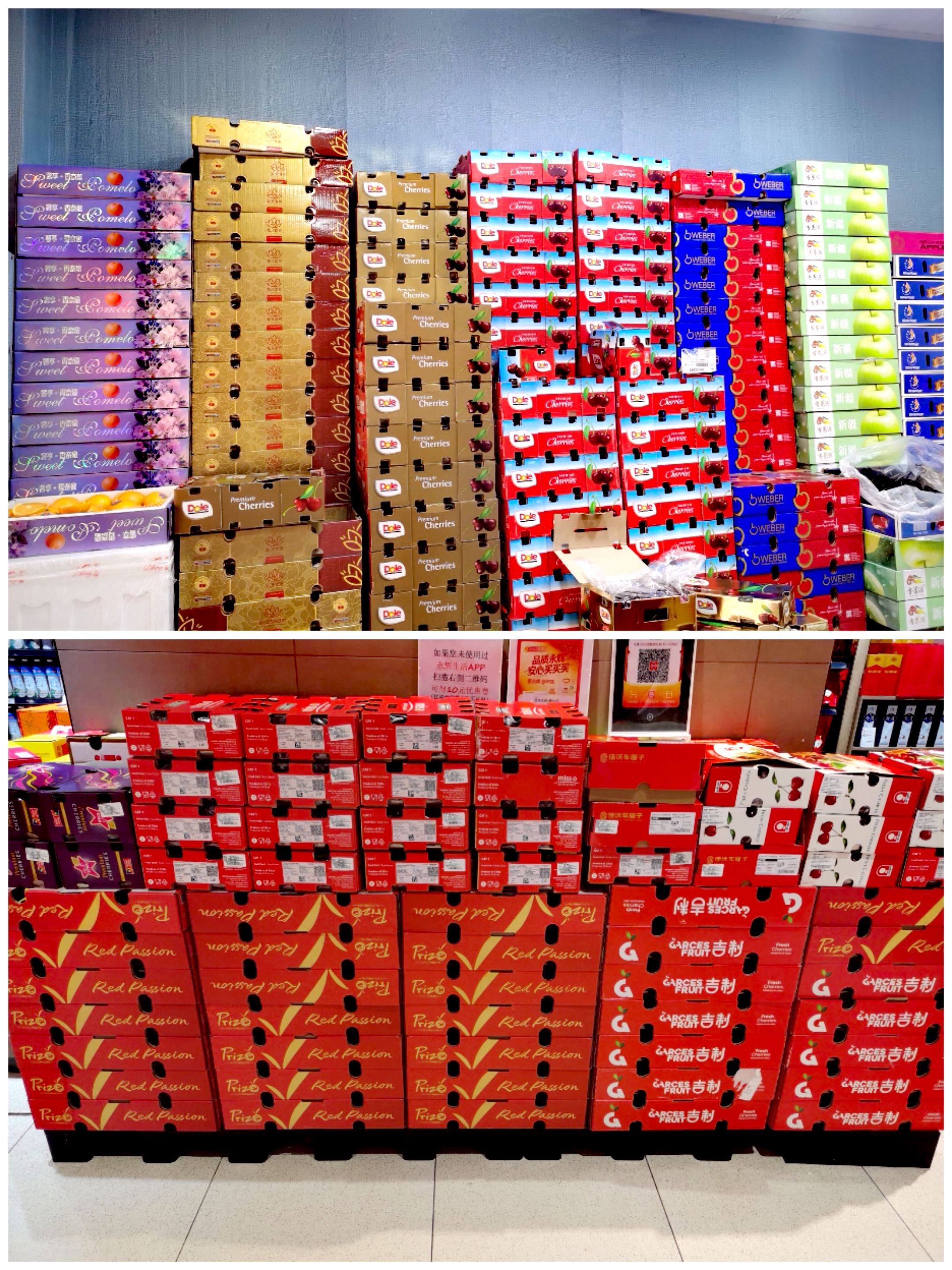 新发地批发市场某商铺及永辉超市(瀛海环宇坊店)的车厘子货架。