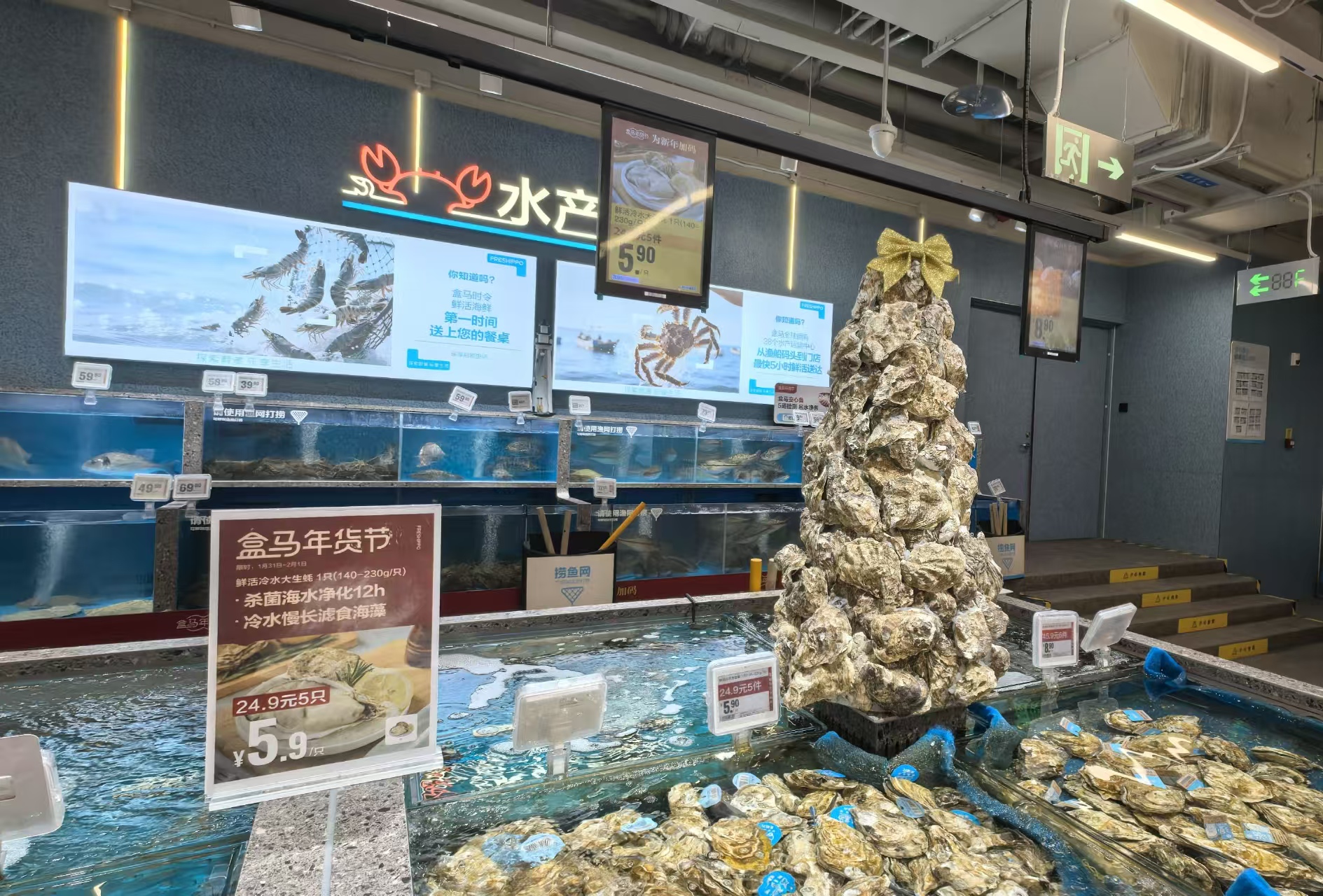 2月8日,在房山区盒马门店,水产区贴出东星斑、帝王蟹、波士顿龙虾等宣传图,一旁的生蚝壳堆叠成塔。工作人员称,这两周前来购买高端水产的人明显变多,还有人询问能不能除夕当天来买,“除夕要尽早来,这类食材很紧俏,如果要的量很大,建议提前沟通。”