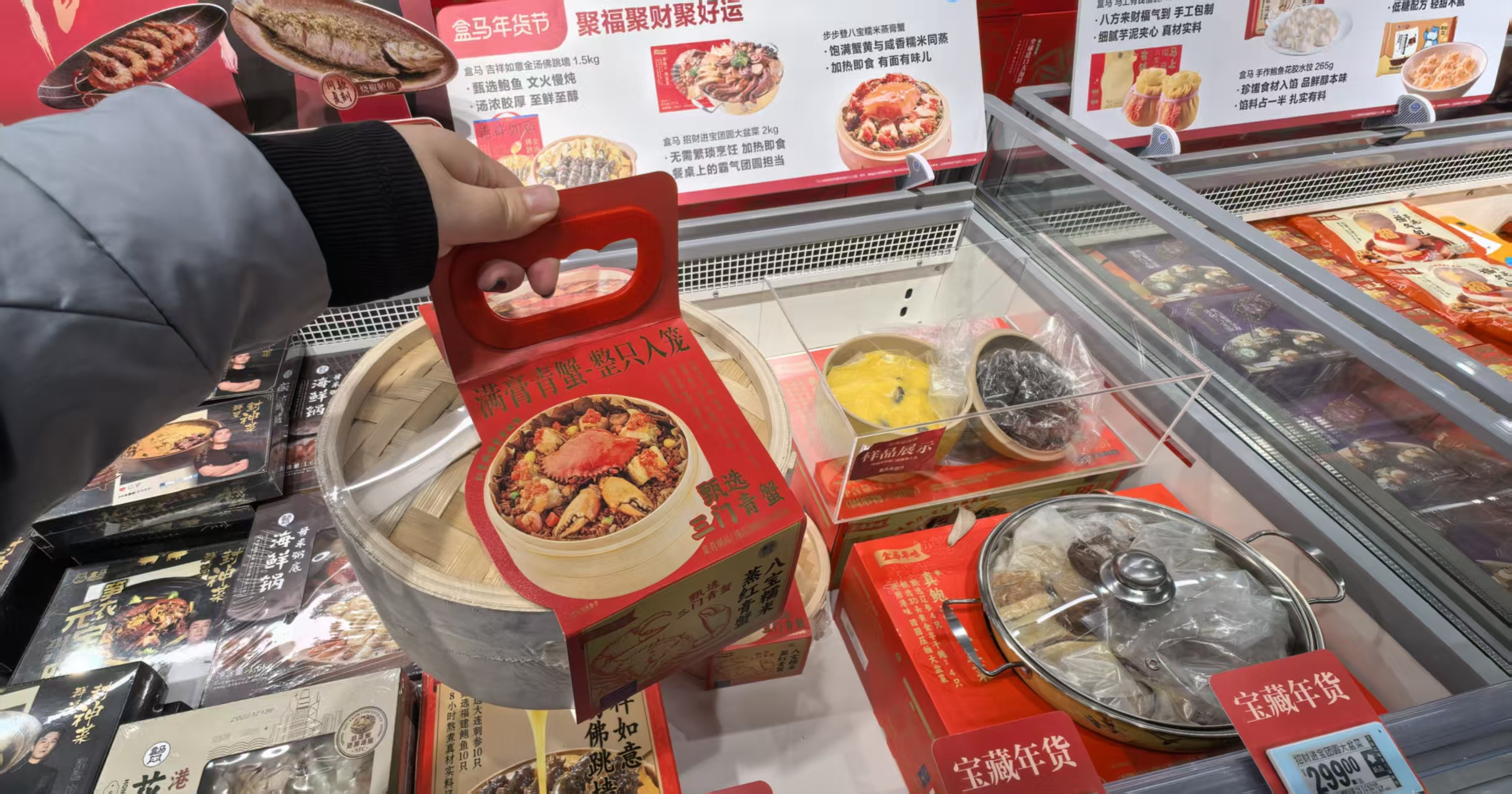 新京报记者在走访中看到,今年水产预制菜的品类更加丰富,从适合年夜饭的佛跳墙、盆盆菜、糯米蒸膏蟹,到养生属性的小米海参、黑松露鲍汁鲍鱼,再到休闲属性的青花椒烤鱼、蒜蓉小龙虾、芝士帝王蟹腿,覆盖了不同消费层次和口味需求。盒马还联合综艺《一饭封神》中的明星厨师,推出“群星封神菜”系列,包含香辣蟹、烧椒鲈鱼等多款预制菜肴。