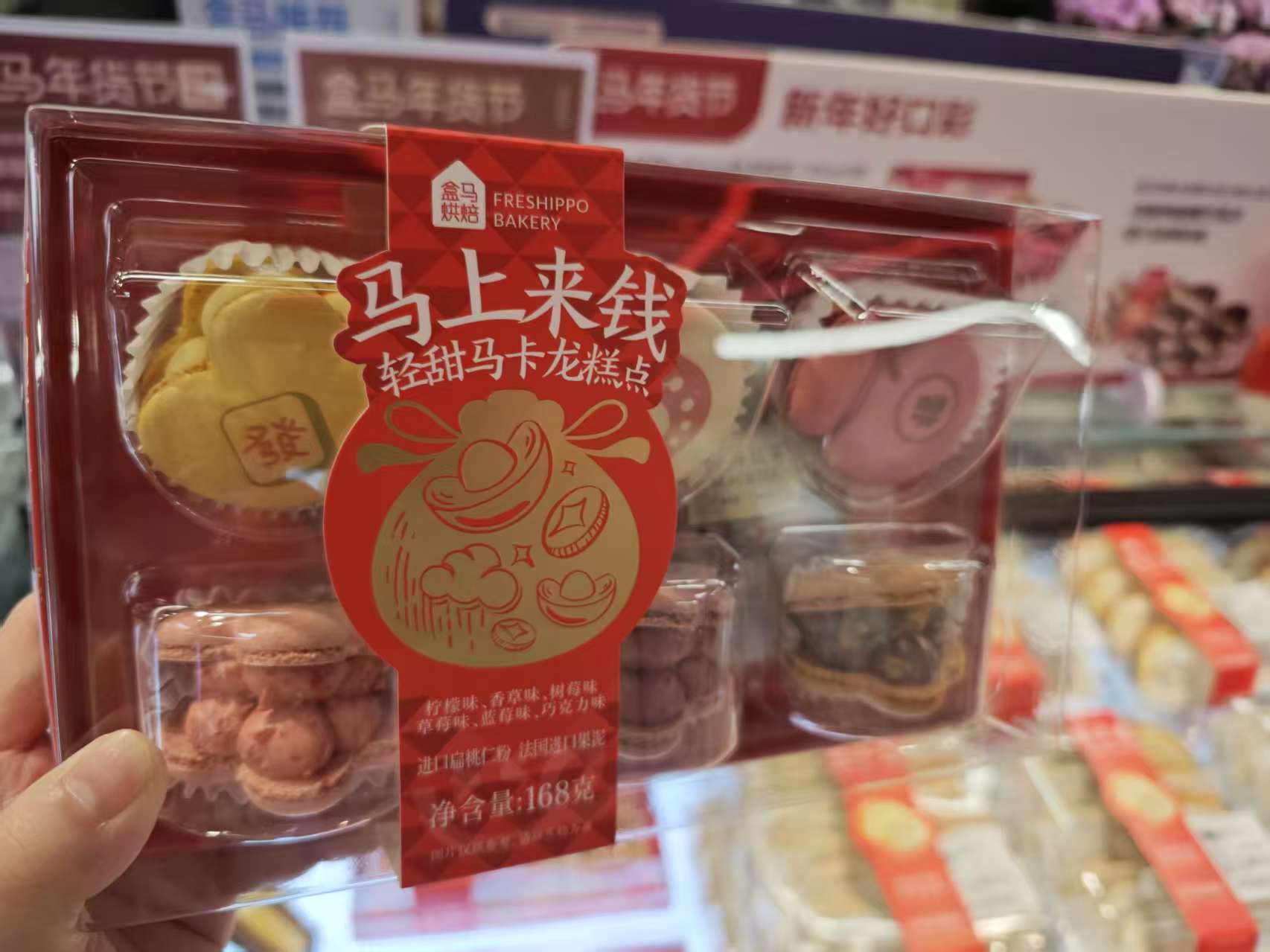 盒马推出的“马上来财”轻甜马卡龙糕点。