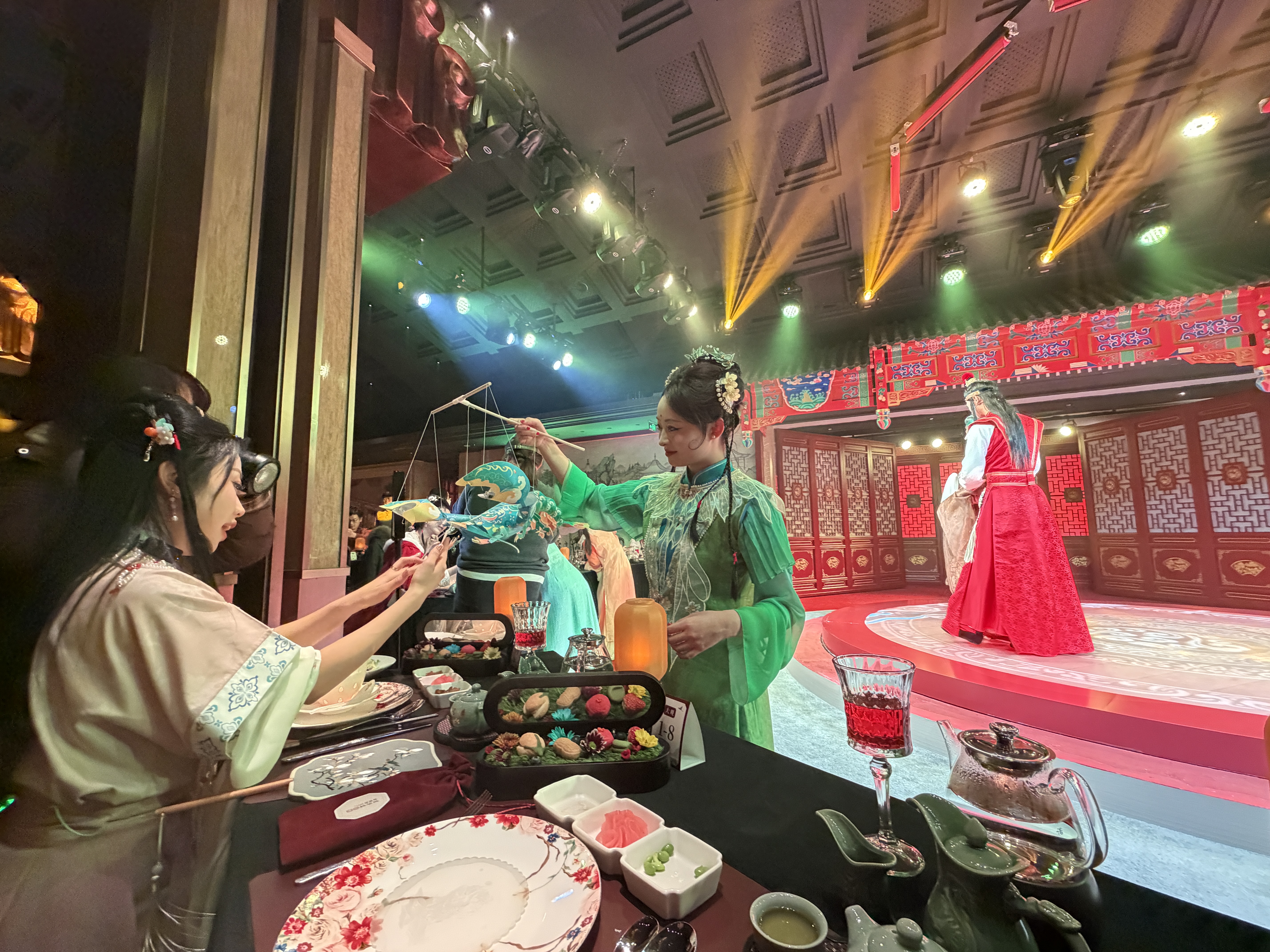 以古典文学经典桥段为叙事脉络,食客可以边吃边看边体验,还可以和演员进行沉浸式互动。新京报记者 王萍 摄