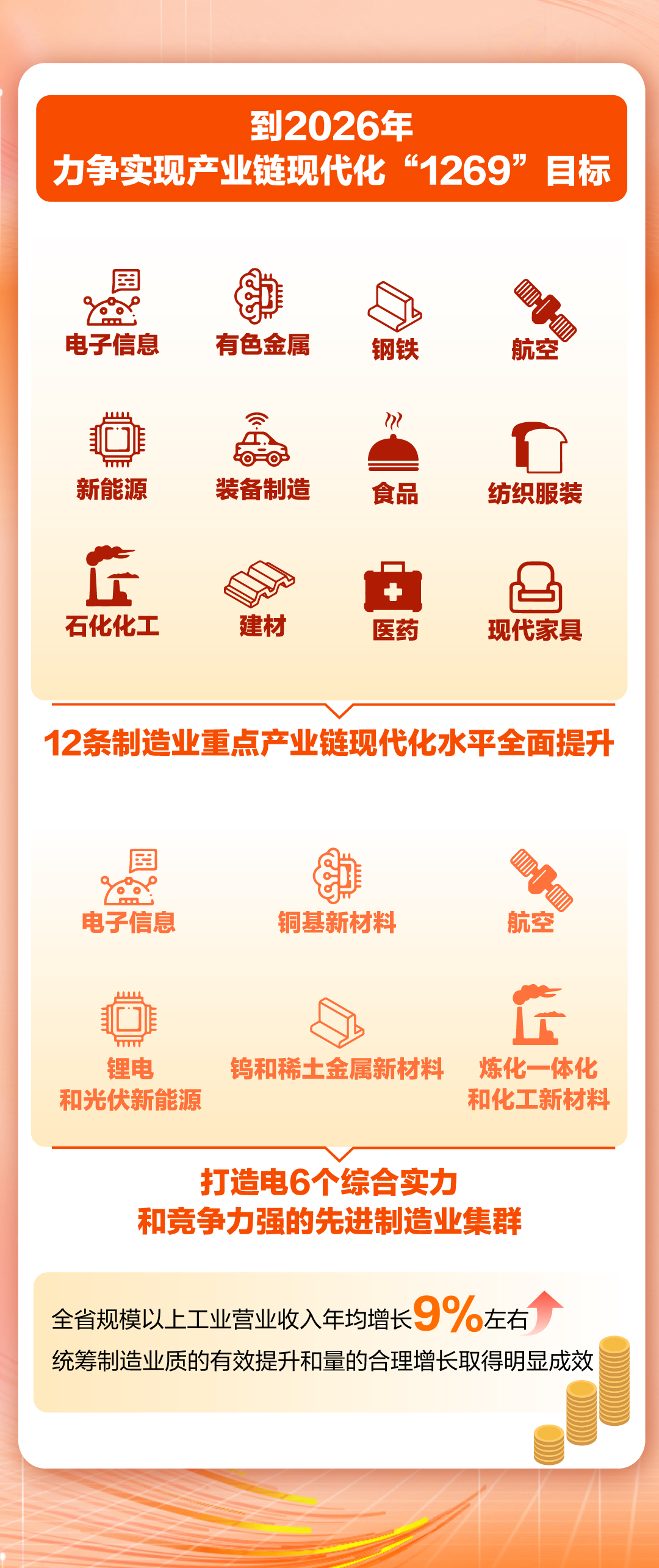 这一计划提出,到2026年,力争实现产业链现代化“1269”目标,即:电子信息、有色金属、装备制造、新能源等12条制造业重点产业链现代化水平全面提升,打造电子信息、铜基新材料、锂电和光伏新能源等6个综合实力和竞争力强的先进制造业集群,全省规模以上工业营业收入年均增长9%左右,统筹制造业质的有效提升和量的合理增长取得明显成效。