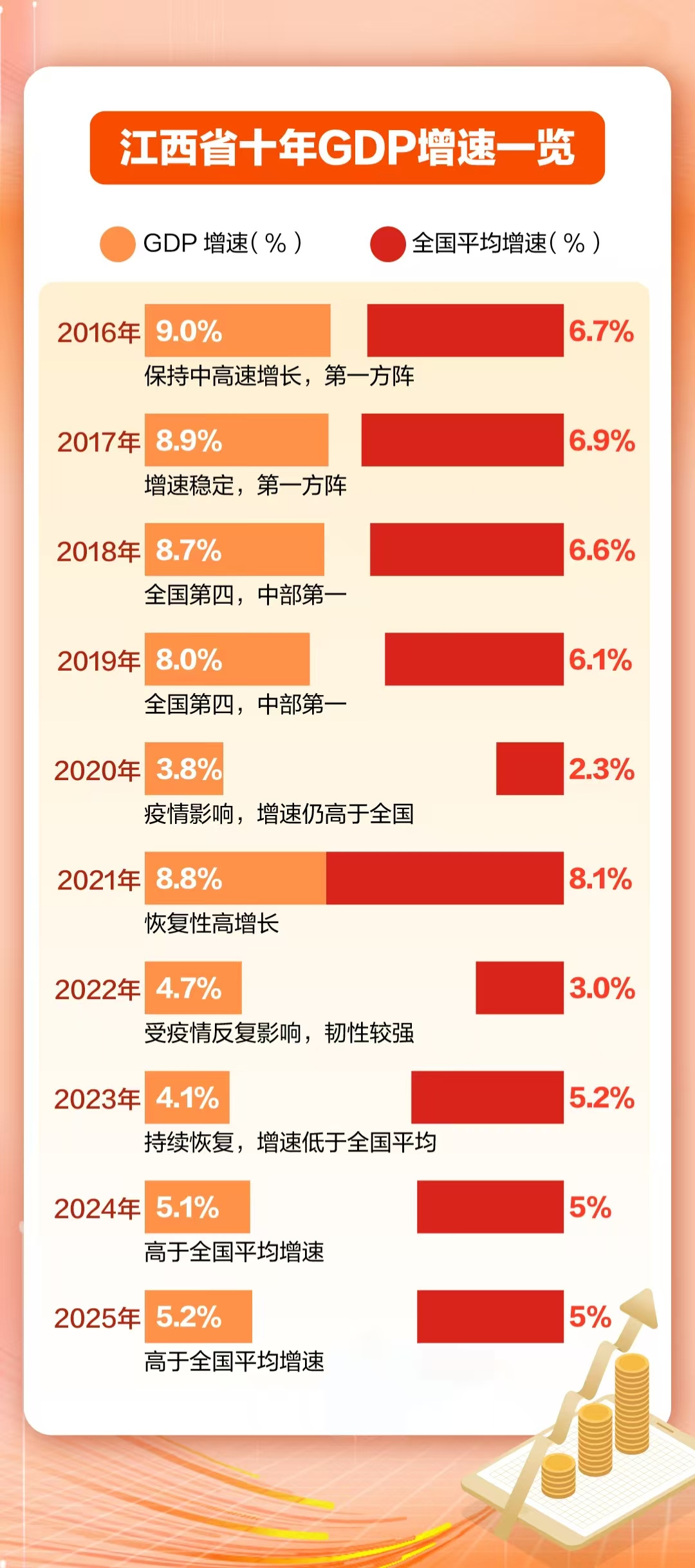 在“1269”目标指引下,江西省奋起直追,2024年、2025年的GDP增速从谷底攀升到5.1%和5.2%,连续两年高于全国平均增速。