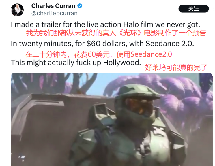 好莱坞导演们更是集体“破防”。导演查尔斯·柯兰(Charles Curran)表示,只需20分钟、60美元,就能做一部电影预告;导演安德鲁·奥莱克(Andrew J. Oleck)说:“一个提示词就能做十几秒的视频”;导演布雷特·斯图尔特(Brett Stuart)已准备好用Seedance2.0拍片,他表示“只需1个提示词,指定5个镜头,以及一张图片,就能生成动画短片。”而在网上“激情发帖”的最后,上述导演不约而同总结道:“好莱坞完蛋了”。