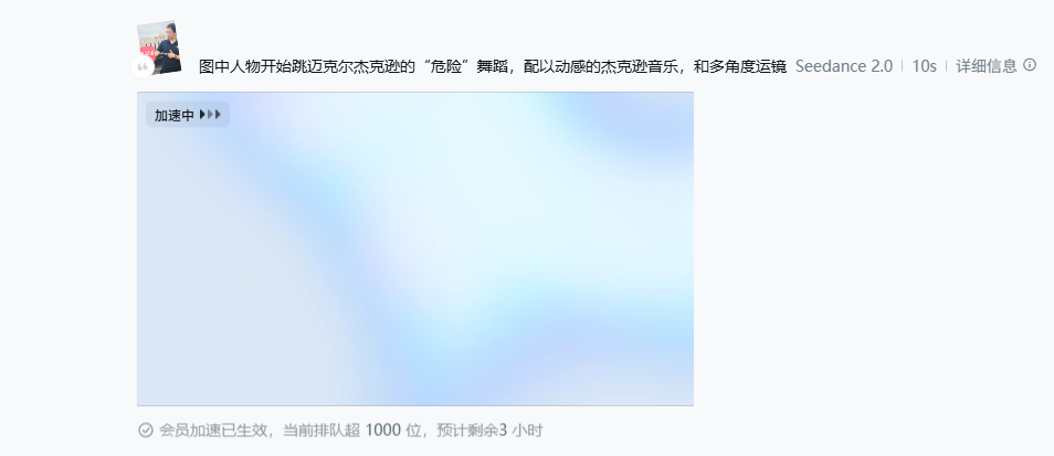 在国内,随着Seedance2.0知名度的提升,相关AI生成视频的传播也越来越广,引发“全民狂欢”,2月13日,新京报贝壳财经记者再次使用即梦生成视频时,被提示“当前排队超1000位,预计剩余3小时”。