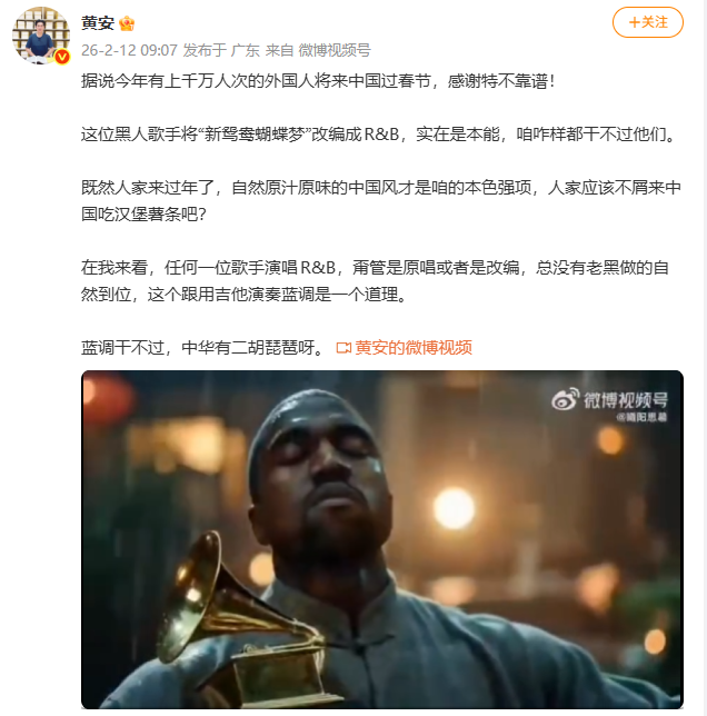 贝壳财经记者注意到,《新鸳鸯蝴蝶梦》的原唱歌手黄安也转发了这一视频,并评论称“这位黑人歌手将‘新鸳鸯蝴蝶梦’改编成R&B,实在是本能,咱咋样都干不过他们。”