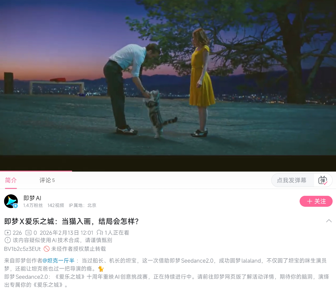 2月13日中午,贝壳财经记者注意到,即梦AI在官方B站账号上上传了3条爱乐之城主题的AI生成视频,视频的最后明确标明“素材由官方合作授权”。这或许是一次积极尝试。