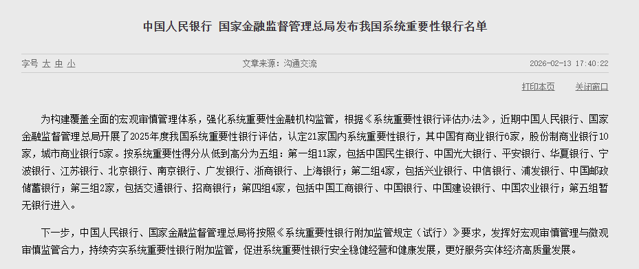 新京报讯 据中国人民银行网站消息,为构建覆盖全面的宏观审慎管理体系,强化系统重要性金融机构监管,根据《系统重要性银行评估办法》,近期中国人民银行、国家金融监督管理总局开展了2025年度我国系统重要性银行评估,认定21家国内系统重要性银行,其中国有商业银行6家,股份制商业银行10家,城市商业银行5家。按系统重要性得分从低到高分为五组:第一组11家,包括中国民生银行、中国光大银行、平安银行、华夏银行、宁波银行、江苏银行、北京银行、南京银行、广发银行、浙商银行、上海银行;第二组4家,包括兴业银行、中信银行、浦发银行、中国邮政储蓄银行;第三组2家,包括交通银行、招商银行;第四组4家,包括中国工商银行、中国银行、中国建设银行、中国农业银行;第五组暂无银行进入。