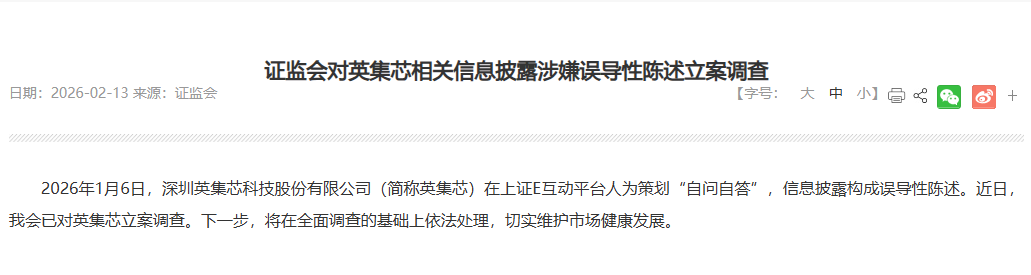 新京报讯 据证监会网站消息,2026年1月6日,深圳英集芯科技股份有限公司(简称英集芯)在上证E互动平台人为策划“自问自答”,信息披露构成误导性陈述。近日,证监会已对英集芯立案调查。下一步,将在全面调查的基础上依法处理,切实维护市场健康发展。