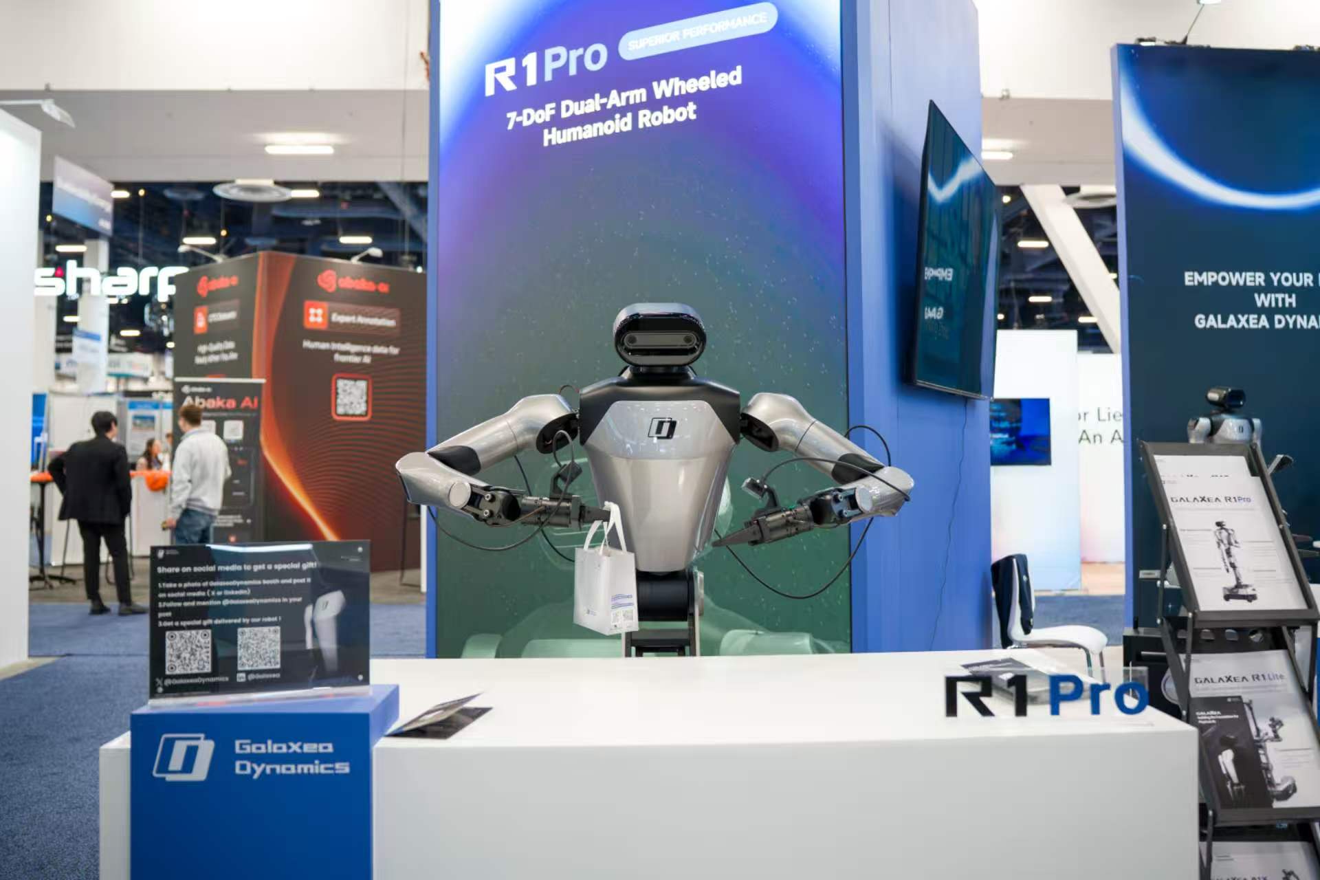在人形机器人展区,星海图(北京)人工智能科技股份有限公司展示了仿人形轮式双臂机器人R1 Pro,这款产品全身拥有26个自由度,双臂最大负载10kg,专为导航、精细操作及复杂具身任务而设计。