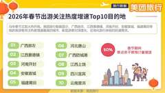 与此同时,一批文化底蕴深厚、体验独特的中小城市快速“出圈”。美团旅行数据显示,广西崇左、江西景德镇、河南开封、安徽宣城、福建莆田、河北唐山、广西防城港、江西上饶、四川宜宾、云南普洱跻身游客关注热度增速最高的城市,彰显出游客对深度化、在地化旅行体验的旺盛需求。