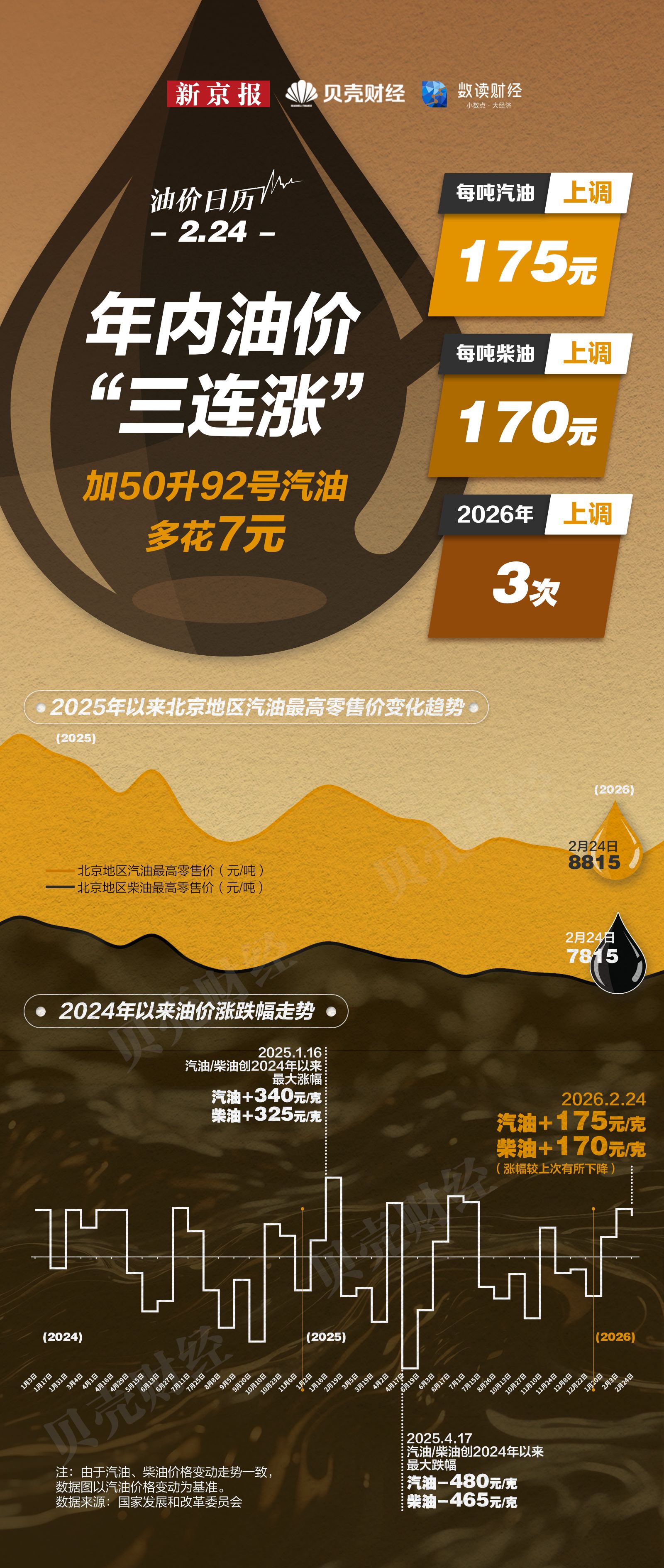 据国家发展改革委消息,自2月24日24时起,国内汽、柴油价格(标准品)每吨分别上涨175元和170元,折合成升价,每升92号汽油、95号汽油和0号柴油的升幅分别在0.14元、0.15元、0.14元。2026年成品油调价呈现“三涨零跌一搁浅”的格局,国内成品油零售价格迎来“三连涨”,本轮是今年第四次调价,也是第三次上调。今年国内汽、柴油价格每吨累计上涨465元和450元。北京地区汽油最高零售价8815元/吨,柴油7815元/吨。