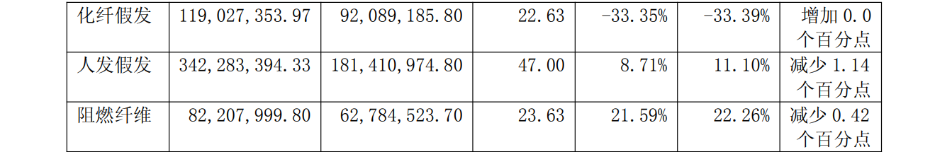 同期,由于美国线下销售减少,瑞贝卡化纤假发的营收同比下滑33.35%至1.19亿元;非洲地区的销售减少,则导致公司化纤发条的营收出现了17.35%的同比降幅。