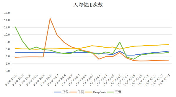 四家AI应用在2月1日至2月23日期间的人均使用次数数据变化 数据来源:QuestMobile