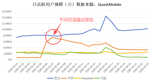 2月7日,千问“送奶茶”的声势达到顶点,甚至一度威胁到豆包的位置(如下图)。2月7日,根据QuestMobile数据,当时千问的日活达到7352万,逼近豆包DAU的7871万。该数据曾在2月11日经由媒体披露,引发舆论关注,后来还曾被千问官方引用称“千问用3个月的时间追平豆包3年的用户规模”。
