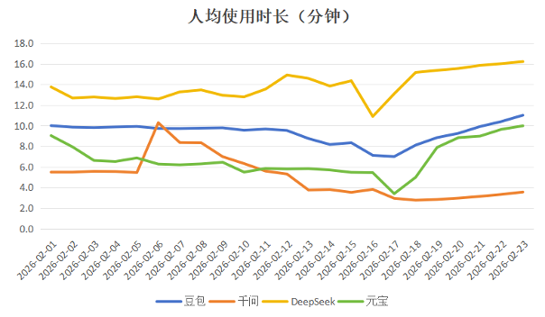 另一方面,零宣发,作为“对比组”的DeepSeek,虽然春节期间其在上述各项数据上几乎全面垫底,但在一项数据上依然领先,那就是人均使用时长(如下图所示)。