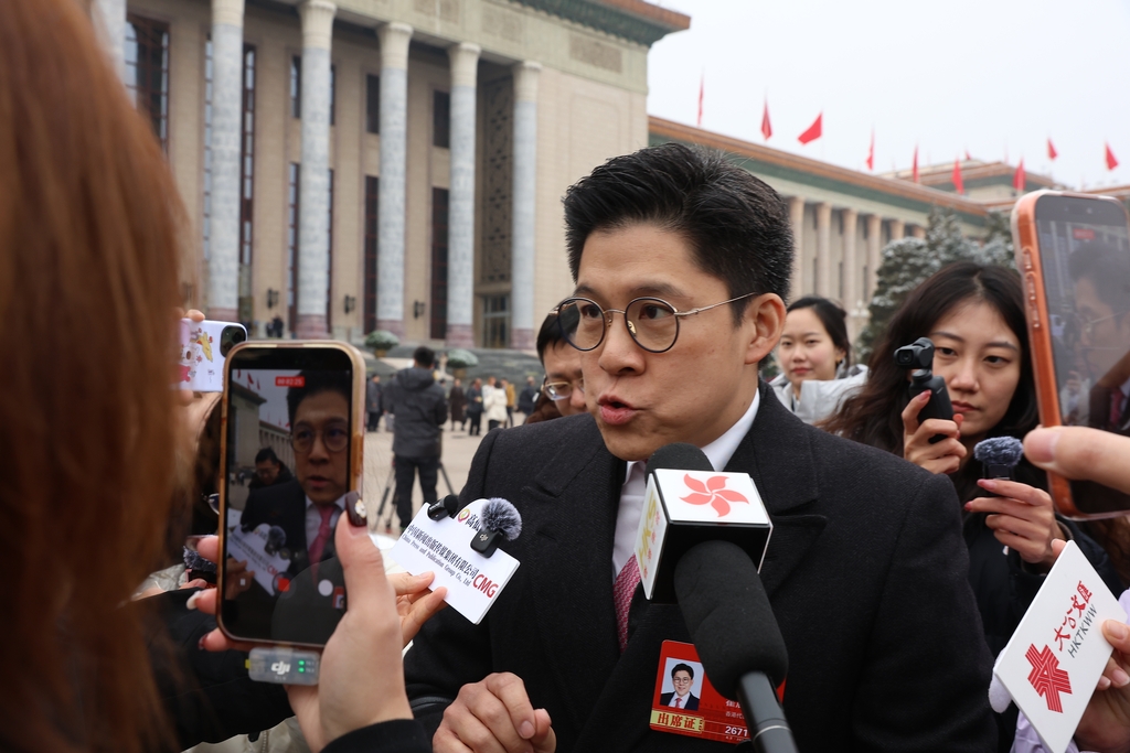 2026年3月5日,北京,第十四届全国人民代表大会第四次会议开幕式后,霍英东集团副总裁霍启刚(中)在人民大会堂外被媒体记者围堵采访。图/ic