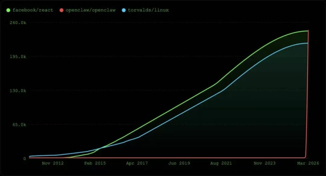 React(绿色)、linux(蓝色)和OpenClaw(红色)的星数增长对比图。来源:数字生命卡兹克