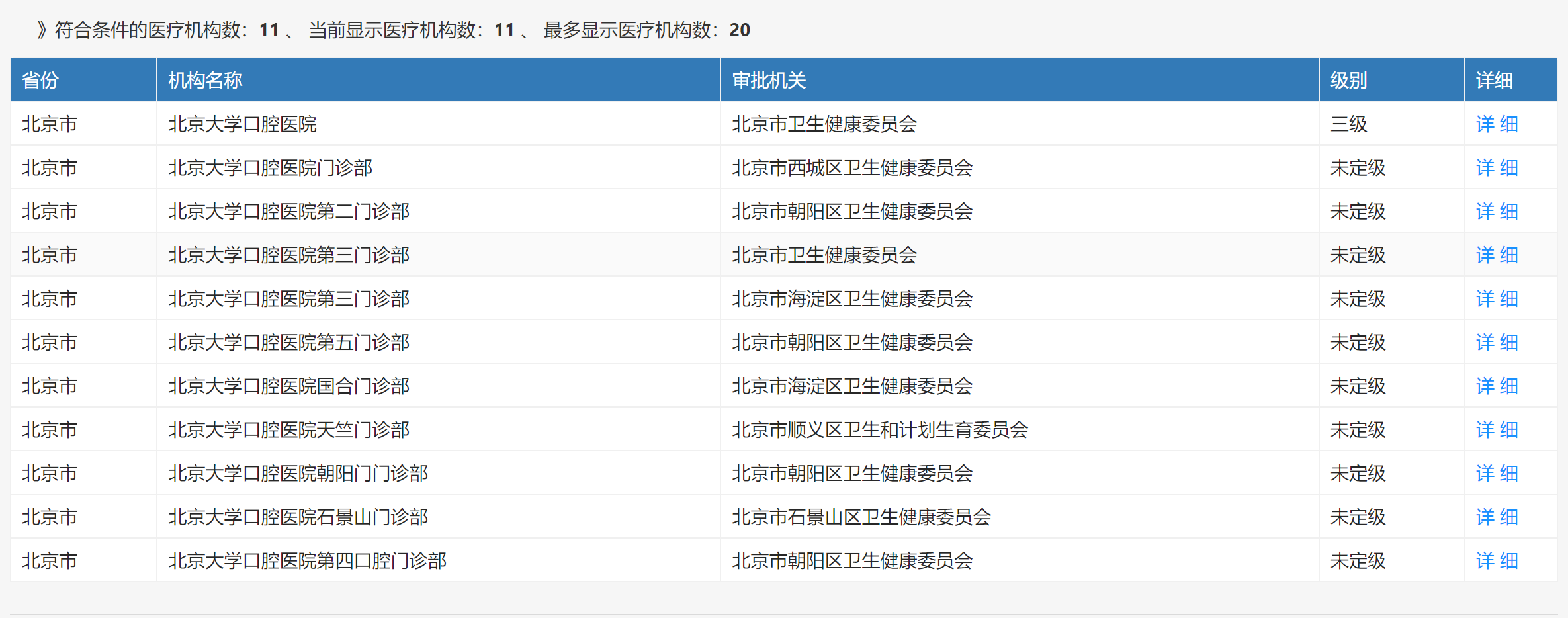 记者在卫健委官网查询发现,除了北京大学口腔医院级别定为三级外,其他的如北京大学口腔医院门诊部(即张敏就诊的门诊部)、北京大学口腔医院第二门诊部等级别均为“未定级”状态。