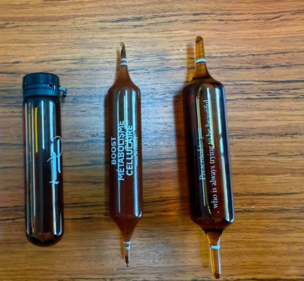 “一桶植物提取物兑入淀粉、色素,搅拌后灌装进两头尖玻璃瓶(这正是‘超模饮’爆款包装)。”销售负责人称,“还有一款叫‘双舱瓶’上面放几粒维生素,下面灌一样的液体。”