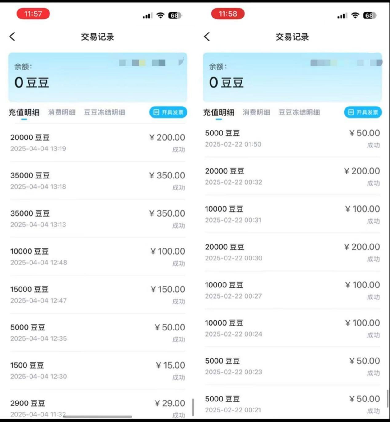 李想在回森充值的部分账单。受访者供图
