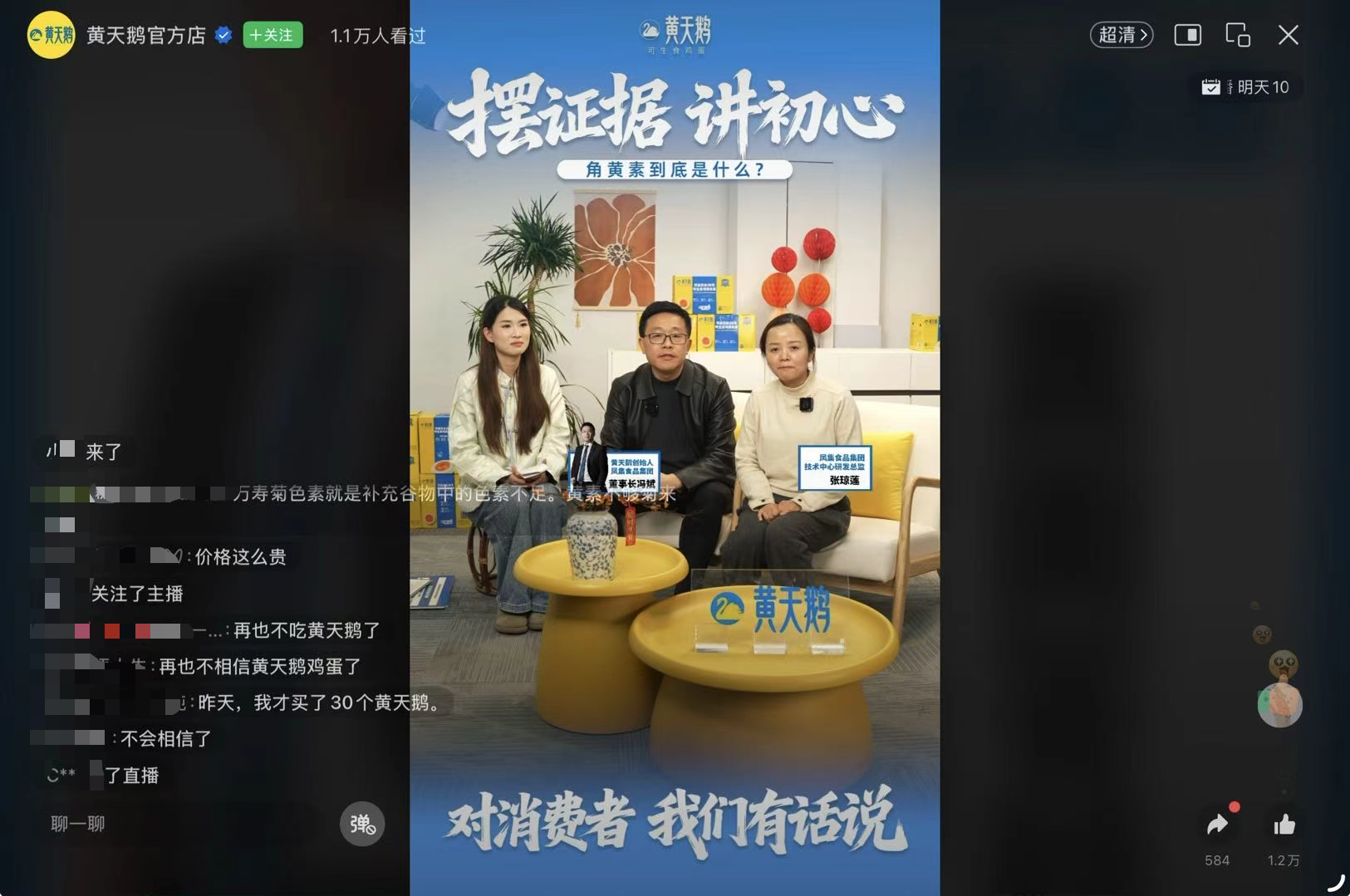黄天鹅创始人冯斌(中)直播回应角黄素争议。 黄天鹅官方店直播截图