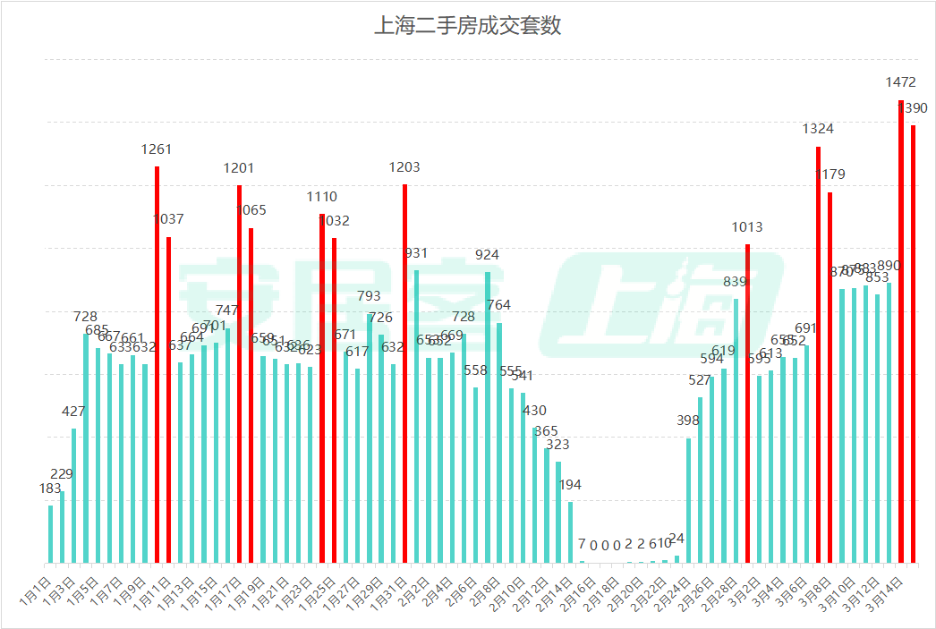 3月14日,上海二手房成交再冲高峰,单日成交1472套,逼近1500套大关,成交量高涨也使得上海二手房网签系统一度“瘫痪”。