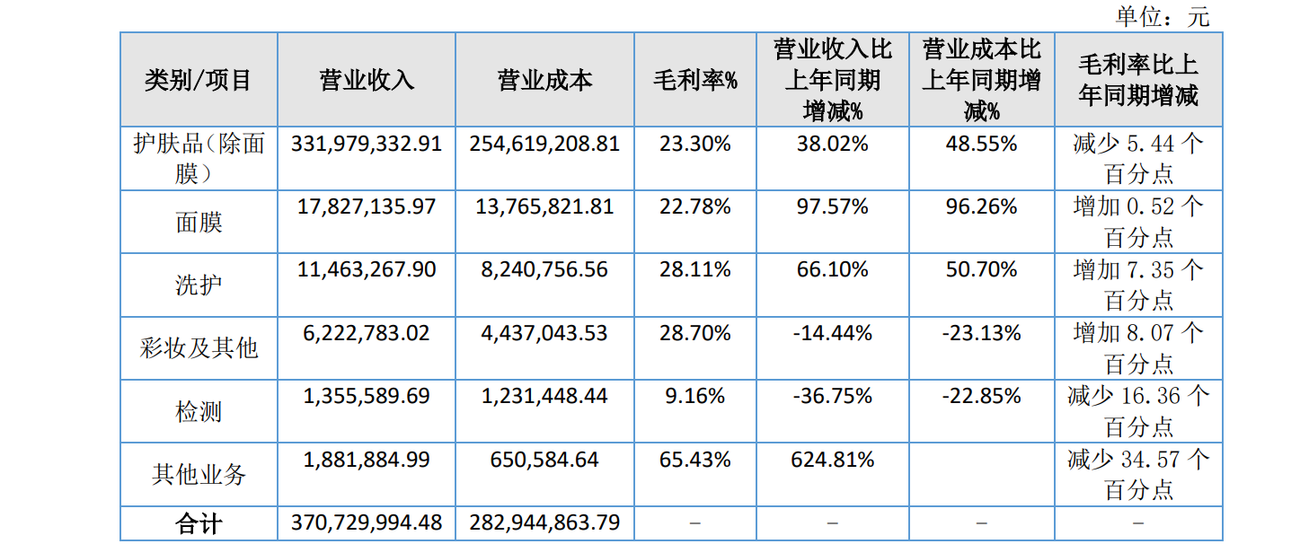 同期,面膜类产品营收同比增长97.57%至1782.71万元,在主营业务收入中的占比约4.8%,得益于产量较快增长、规模效益提升,其毛利率增加0.52个百分点;洗护类产品营收约1146.33万元,占主营业务收入的比重约3.1%;彩妆及其他类产品、检测服务则分别实现营收622.28万元和135.56万元,与上年同期相比下滑了14.44%、36.75%。