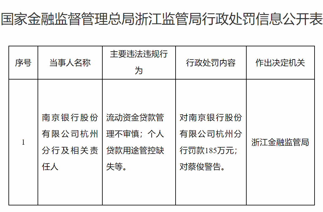 新京报贝壳财经讯(记者黄鑫宇)3月19日,国家金融监督管理总局浙江监管局(即“浙江金融监管局”)官网显示,南京银行杭州分行因流动资金贷款管理不审慎、个人贷款用途管控缺失等违法违规行为,被罚185万元,相关责任人蔡俊被警告。