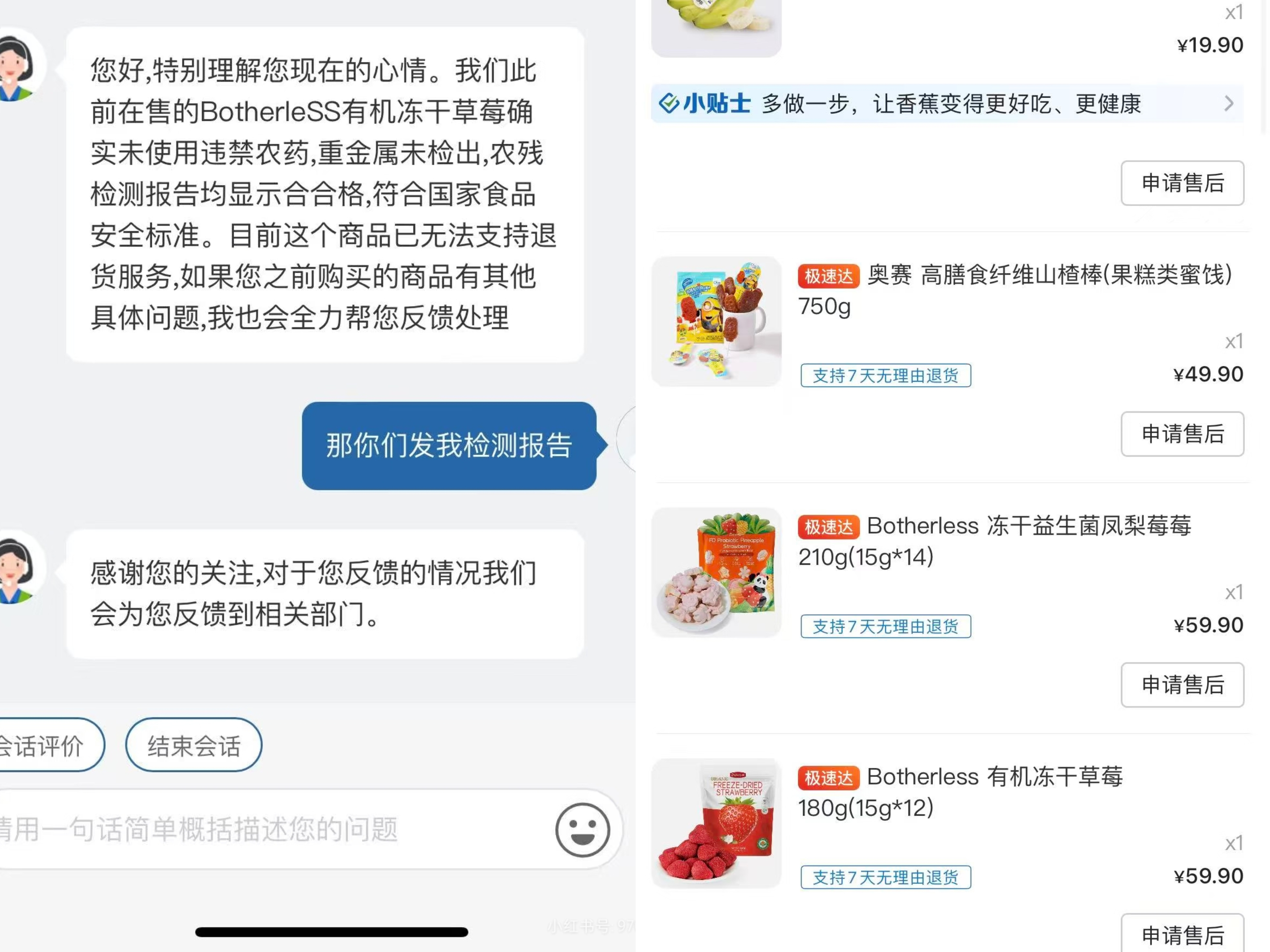 售后服务敷衍是网友吐槽的另一个重点。多位消费者晒出了与山姆线上客服的对话,客服话术基本一致,“在售的Botherless 有机冻干草莓未使用违禁农药,重金属未检出,农残检测报告均显示合格,符合国家食品安全标准。”对于消费者要求提供的检测报告,客服并未给出明确回复。此外,客服表示“无法支持退货服务”。