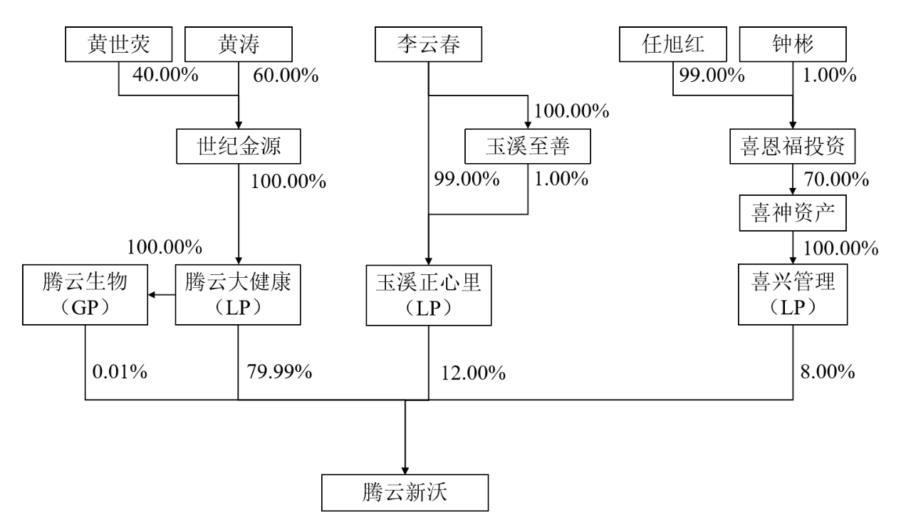 腾云新沃成立于2026年2月,其产权控制关系显示,腾云新沃主要资金来自腾云大健康,而腾云大健康由世纪金源100%出资。