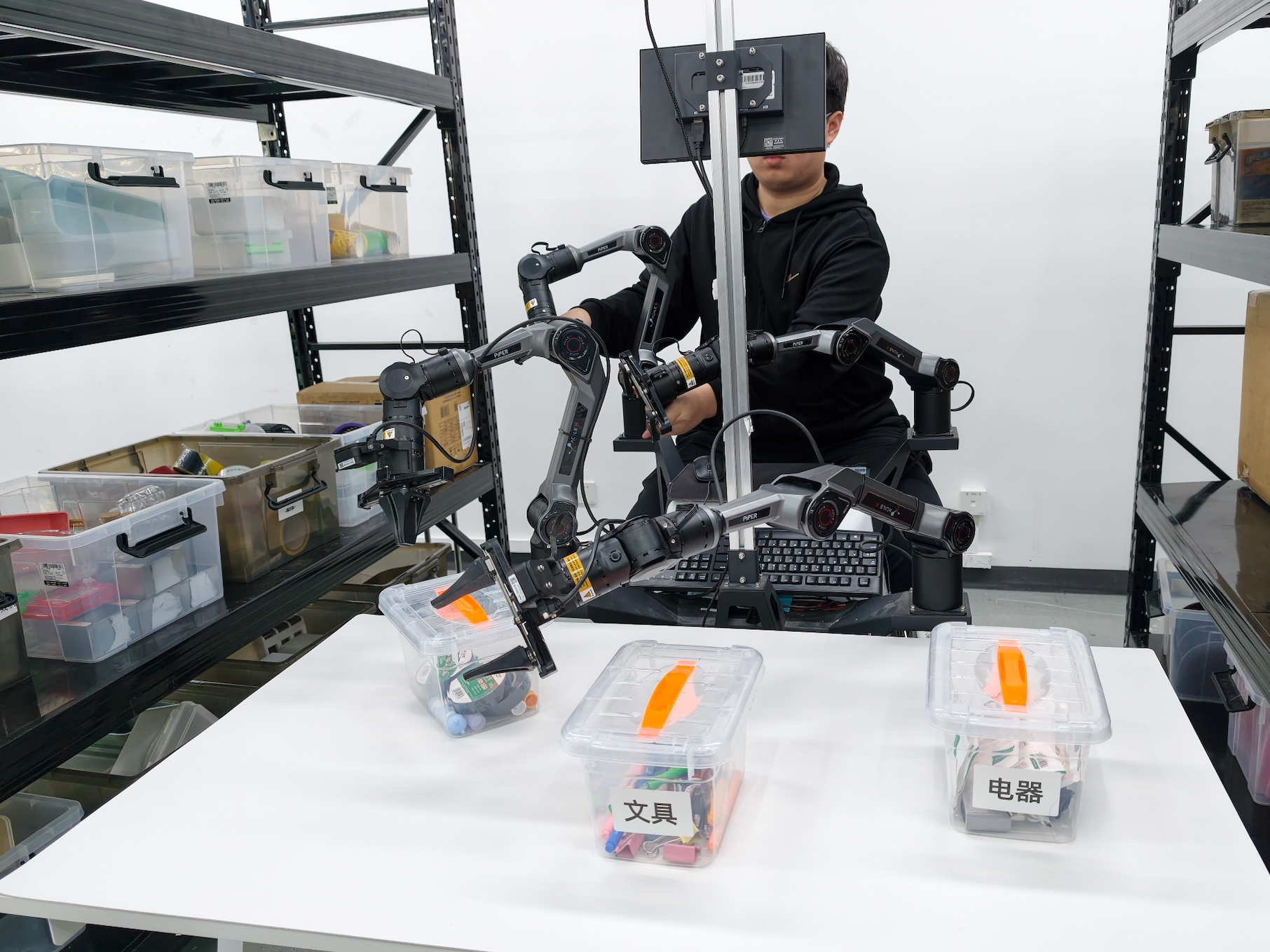 北京人形的工作人员正在遥操机器人拿取物体。新京报贝壳财经记者 韦博雅 摄