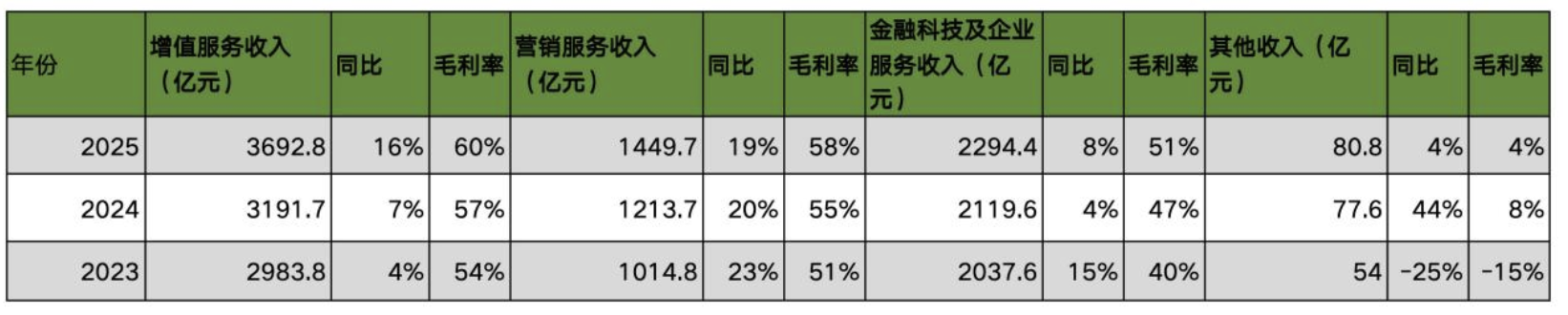 财报显示,2025年,腾讯增值服务收入约3692.8亿元,同比增长16%,毛利率达60%;营销服务收入约1449.7亿元,同比增长19%,毛利率达58%;金融科技及企业服务约2294.4亿元,同比增长8%,毛利率达51%;其他服务收入约80.8亿元,同比增长4%,毛利率达4%。