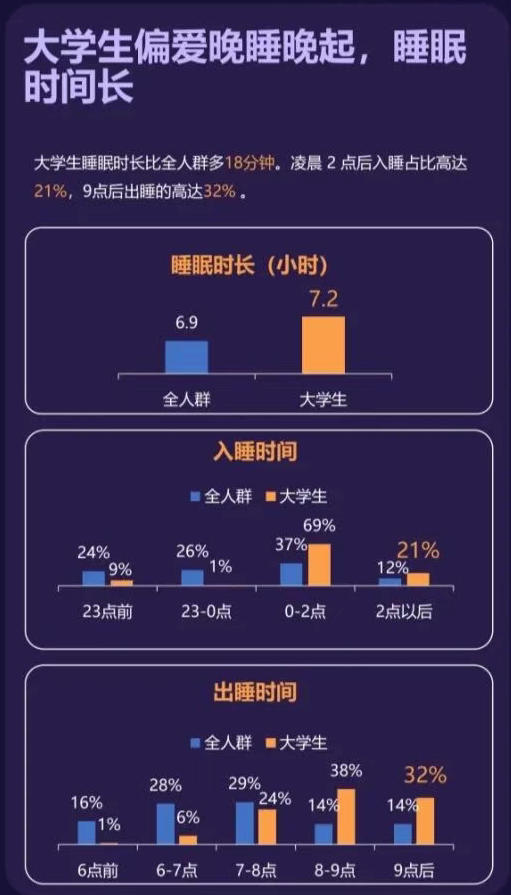 大学生睡眠状况堪忧。白皮书显示,大学生偏爱晚睡晚起,睡眠时间比全人群多18分钟,凌晨2点后入睡占比高达21%,9点后出睡比例高达32%。此外,大学生午睡在30-90分钟的占比高达92%,显著高于全人群水平。15点后午睡出睡占比高达38%,也高于全人群水平。从运动层面来看,大学生日行走步数偏少,日均步数低于5000步的占比为36%,且不喜欢晨练,晨间运动参与率仅为8%,远低于全人群水平。