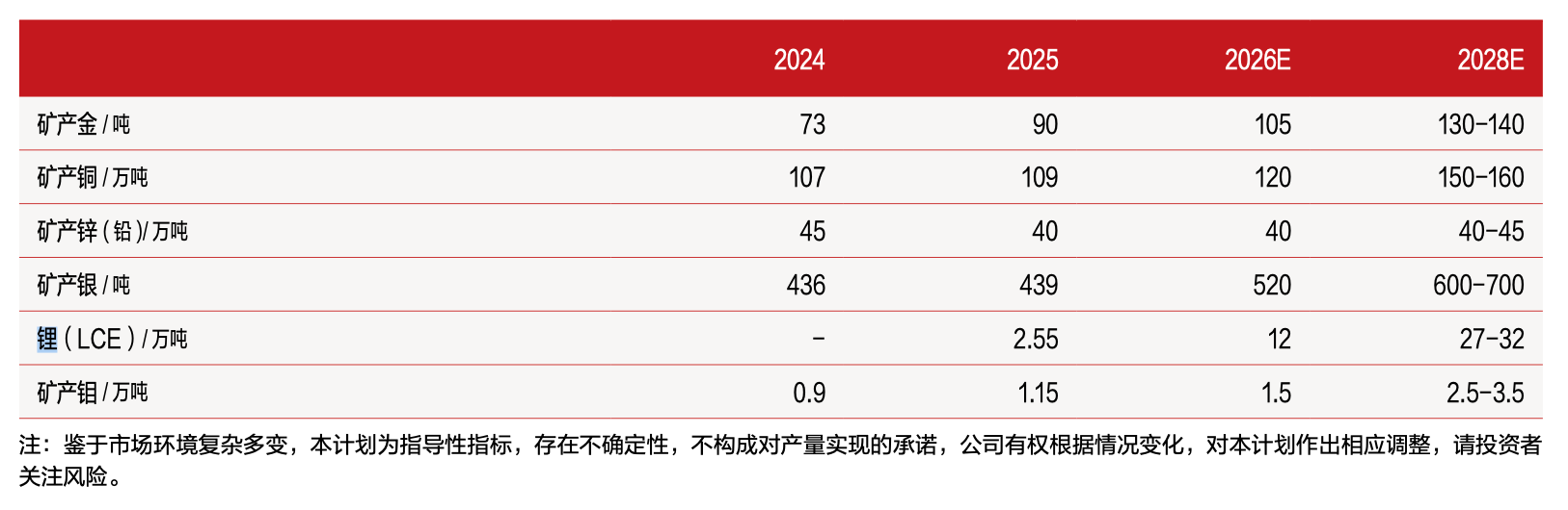紫金矿业主要品种产量规划。图/公司2025年年报