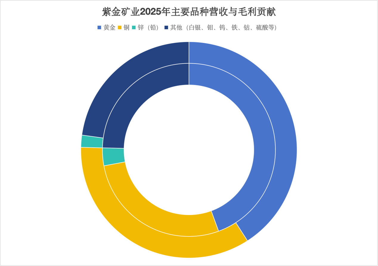 不过,与宏大的未来预期相比,紫金矿业2025年锂板块的收入并不高。黄金与铜依然支撑起了这家巨型矿企约八成的收入及毛利。黄金业务销售收入占报告期内营业收入的44.43%(抵销后),毛利占集团毛利的40.89%;铜业务销售收入占报告期内营业收入的27.62%(抵销后),毛利占集团毛利的34.49%。