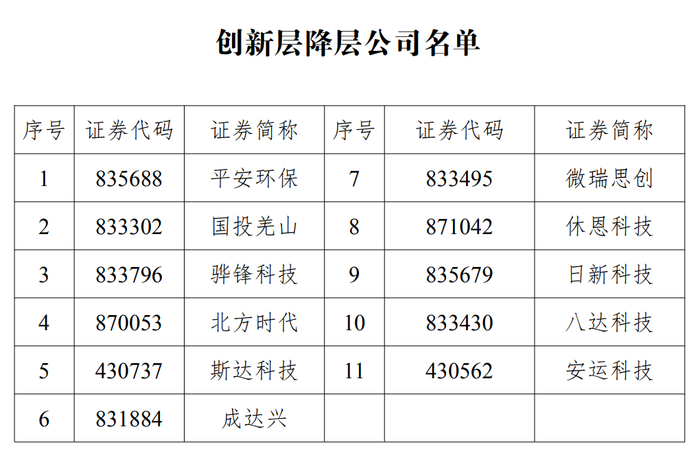 新京报贝壳财经讯(记者黄鑫宇)3月23日,新三板运营主体全国股转公司发布《关于发布湖南平安环保股份有限公司等11家创新层公司降层决定的公告》。