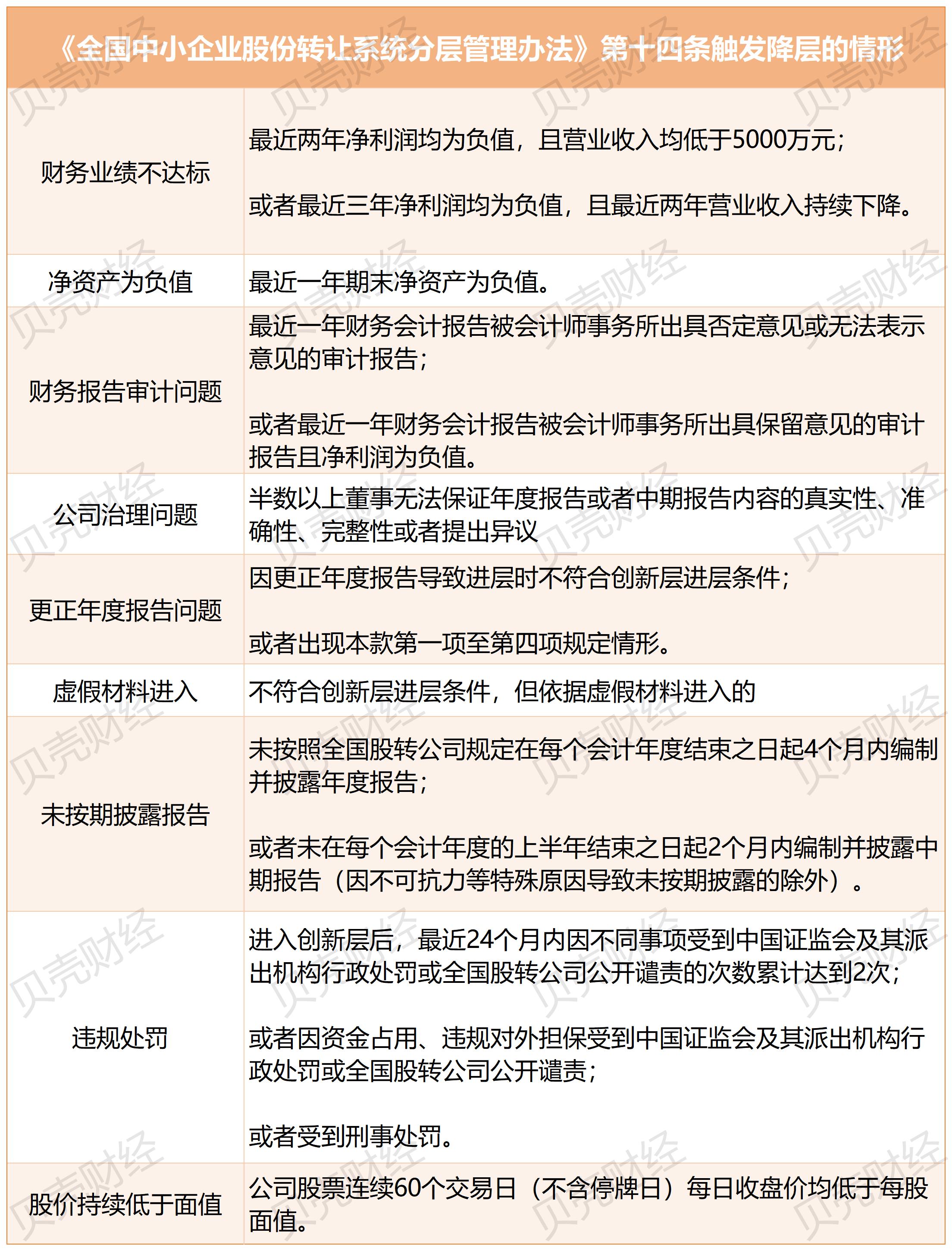 《分层办法》第十四条中还规定了其他触发创新层公司降层的情形,包括“财务业绩不达标”“净资产为负值”等。