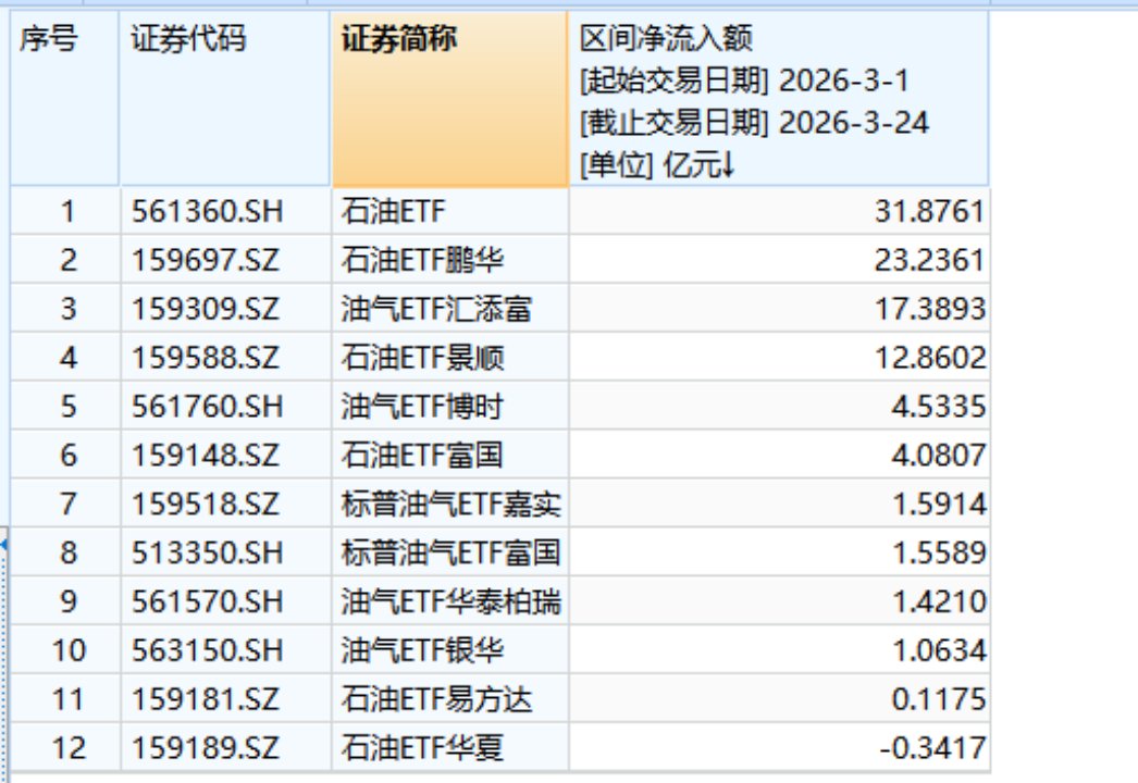 3月以来,12只油气类ETF净买入情况。Wind数据截图