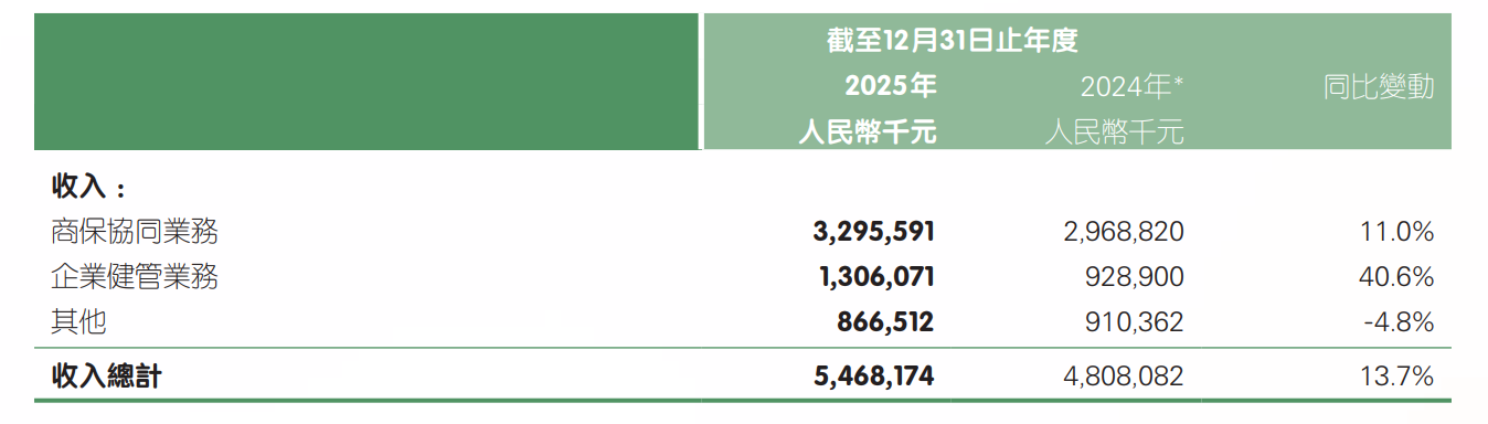 数据显示,2025年,平安好医生实现总收入54.68亿元,同比增长13.7%。其中,企业健管业务收入13.06亿元,同比增长40.6%;商保协同业务收入32.96亿元,同比增长11%;其他业务收入为8.67亿元,同比下降4.8%。