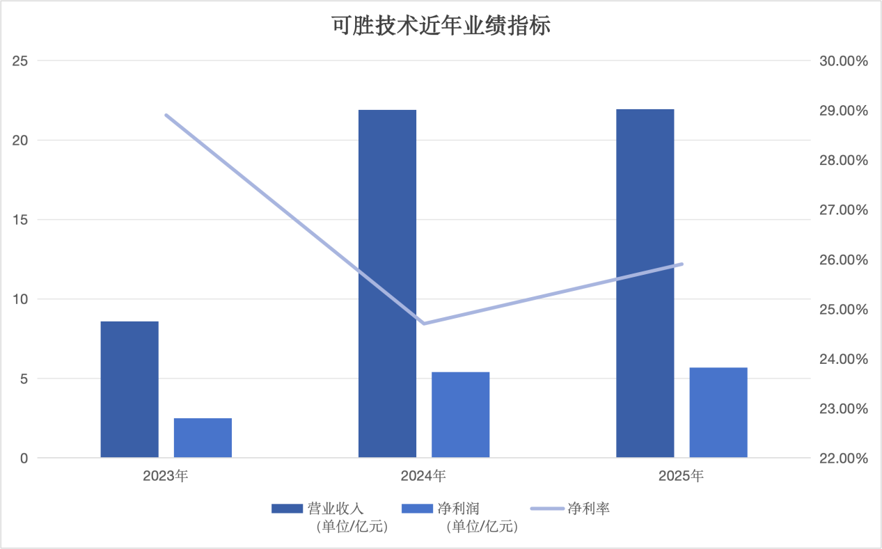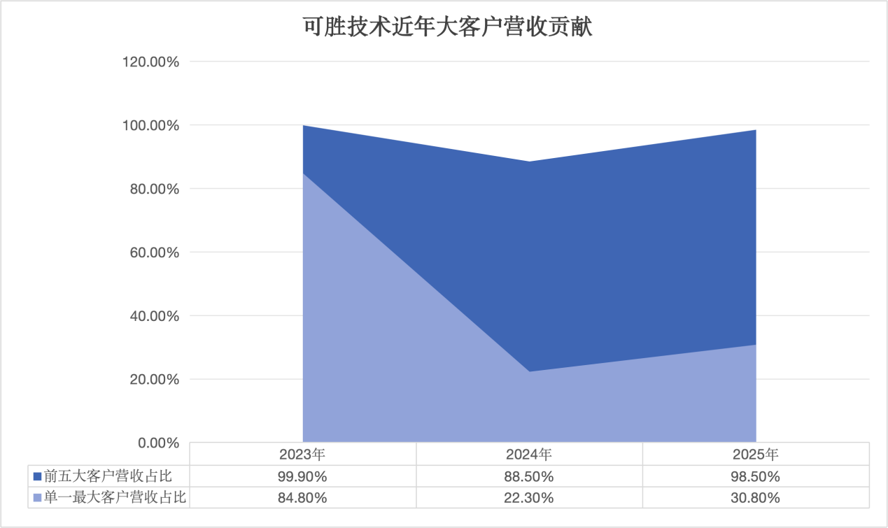 更高的市场集中度给可胜技术带来的是对大客户的依赖。招股书显示,2023年至2025年,前五大客户几乎包揽了可胜技术的全部营收,且单一最大客户的营收占比一度超过80%。公司在招股书中坦言,任何主要客户的流失或其需求减少都可能对公司财务状况和经营业绩造成重大不利影响。