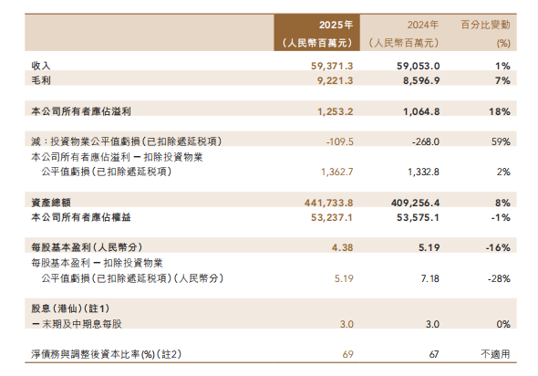 然而,潜在的问题同样不容忽视。尽管2025年中国金茂的股东应占溢利同比增长了18%,但扣除投资物业公平值亏损后的净利润为13.63亿元,仅比上一年度增长2%,因此公司宣布不派发末期股息。而且每股基本盈利同比下降16%至4.38分,盈利质量值得推敲。