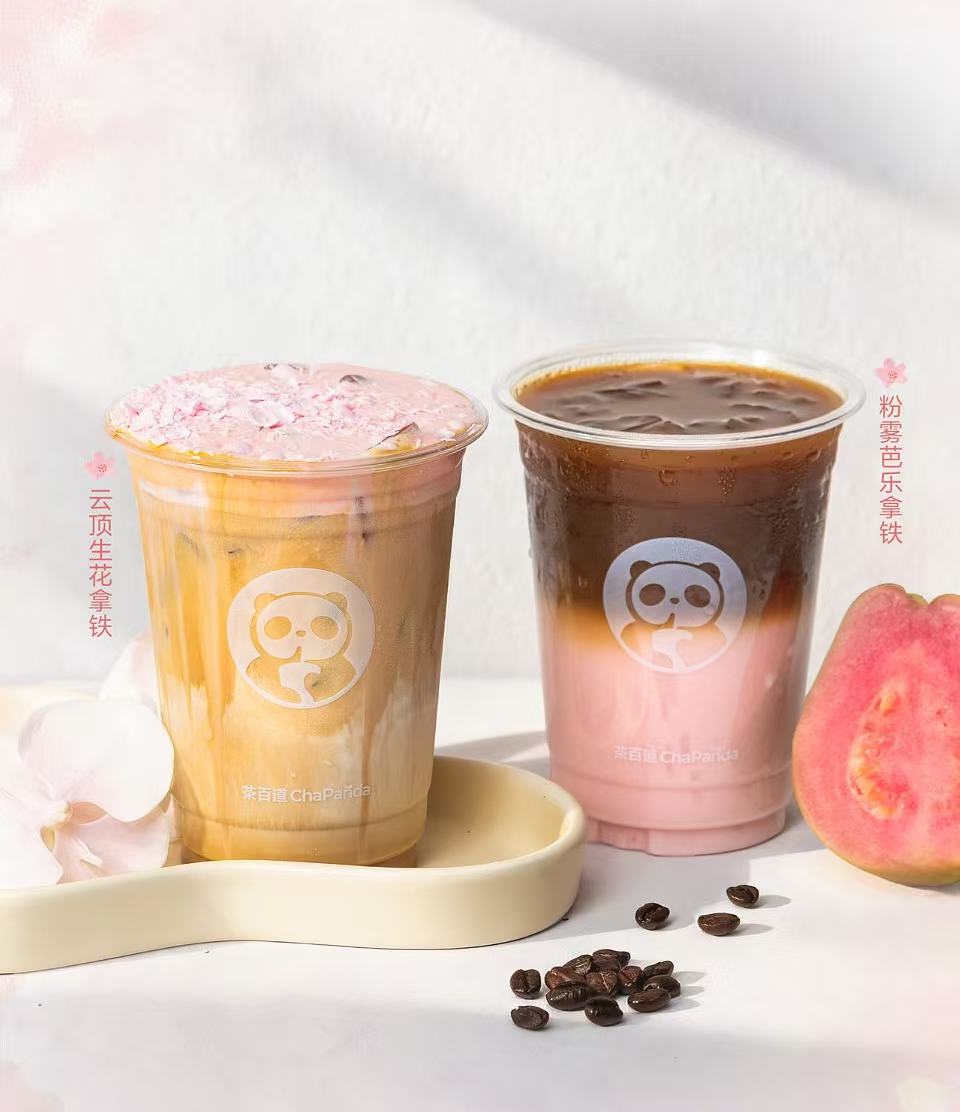 茶百道推出的云顶生花拿铁与粉雾芭乐拿铁。