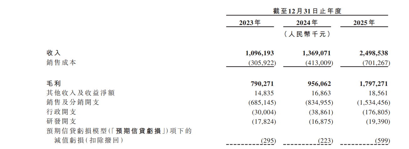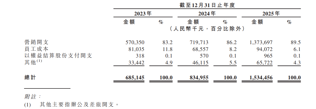 对于2025年超80%的销售及分销开支增幅,该公司解释称,主要原因是把握增长机遇,持续投资渠道扩张及品牌建设,营销开支由2024年的7.197亿元增至2025年的13.737亿元,在2025年公司总收入中的占比约55%。