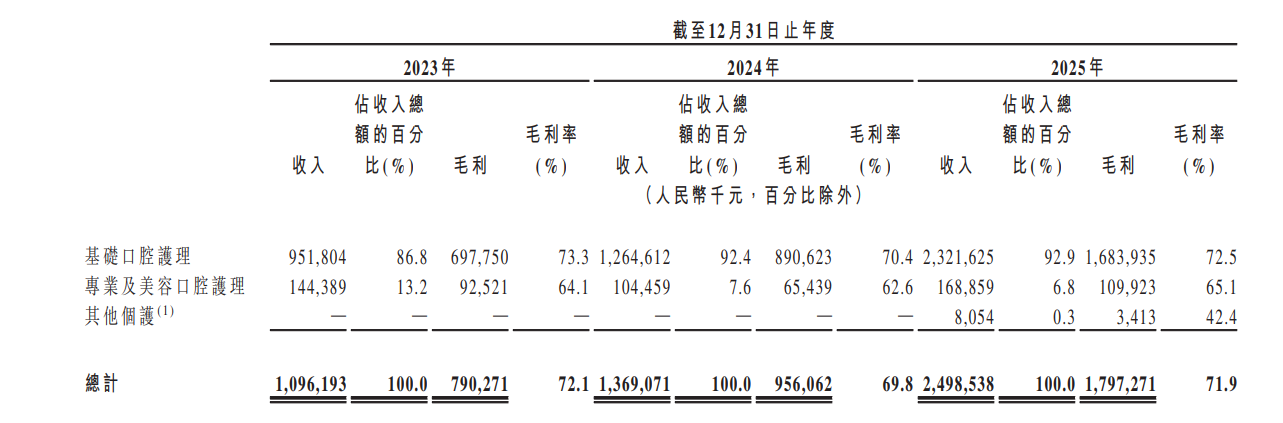 招股书显示,2023年至2024年,基础口腔护理产品分别实现收入9.52亿元、12.65亿元,占公司总收入的比重分别约86.8%和92.4%。到了2025年,这一占比进一步提升至92.9%,收入约23.22亿元。